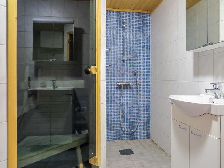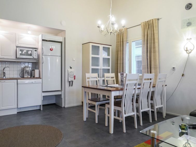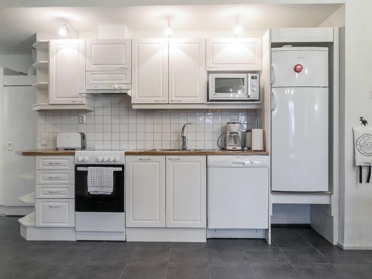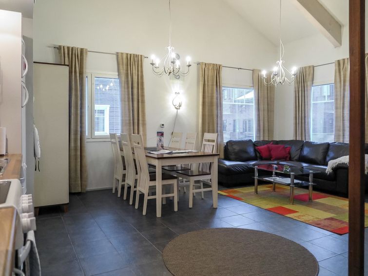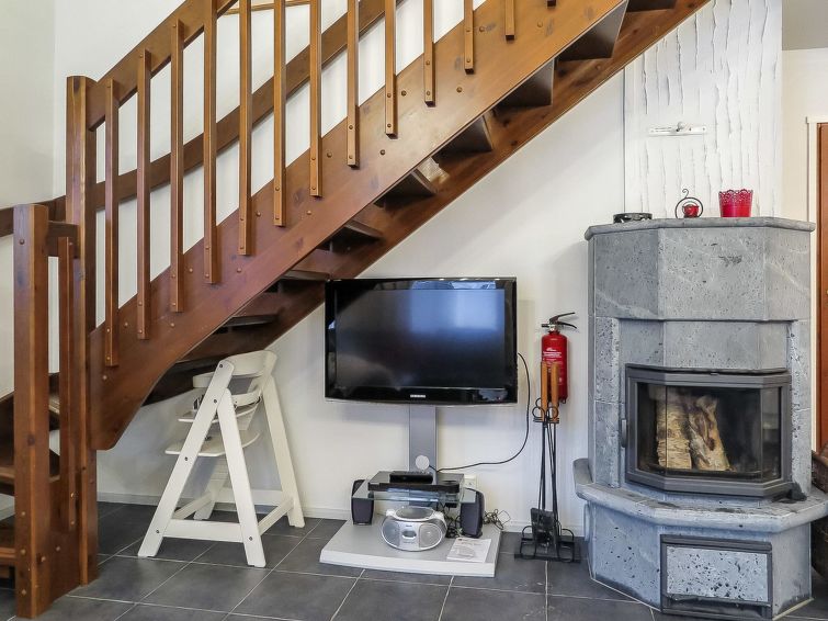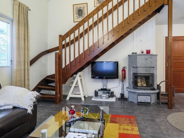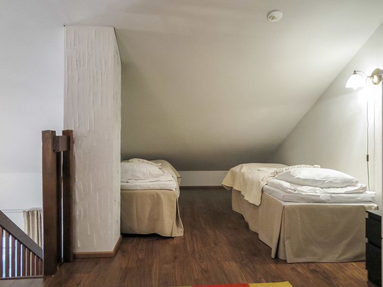 Two-storey apartment in an Alpine-style house, built in 2008. Big kitchen-living room, downstairs bedroom with 2 beds, upstairs bedroom 2 beds, upstairs lobby 2 beds, separate WC. The sauna is on the upper floor, there is also shower room / wc. Two balconies (access to one of the balconies through upstairs bedroom).