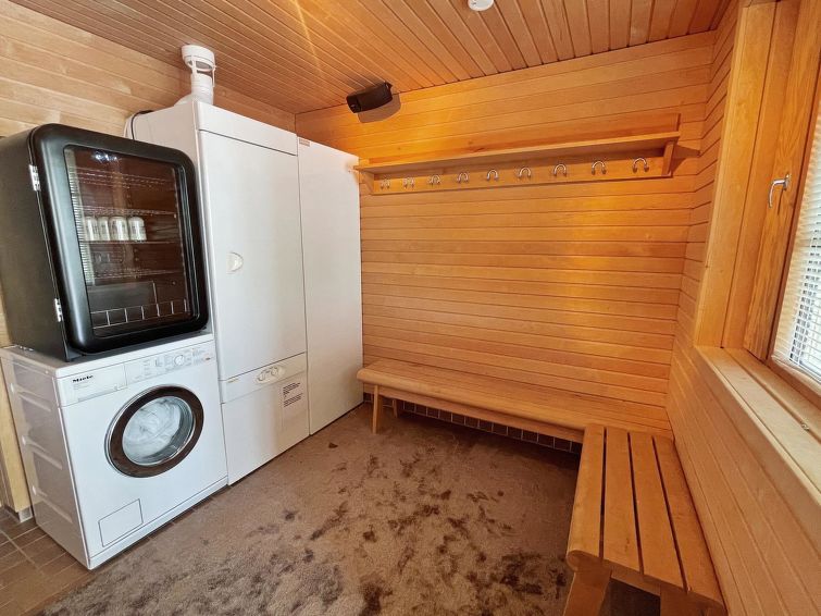 Downstairs there is a glazed cooling terrace at the second entrance. Washroom (2 showers), sauna, toilet, washing machine and drying cabinet. Dressing room.