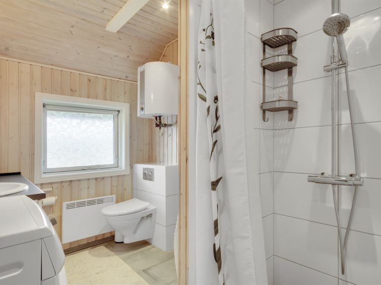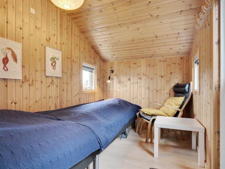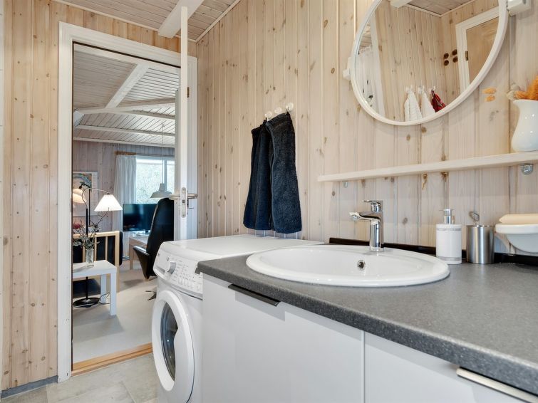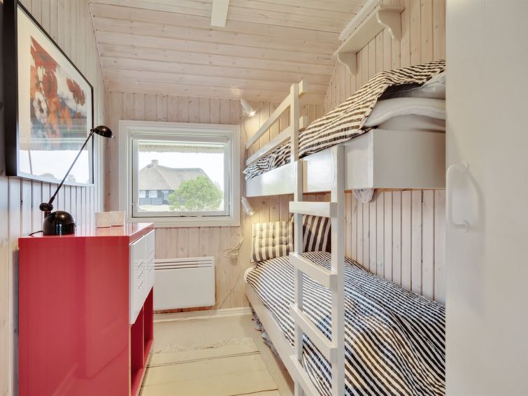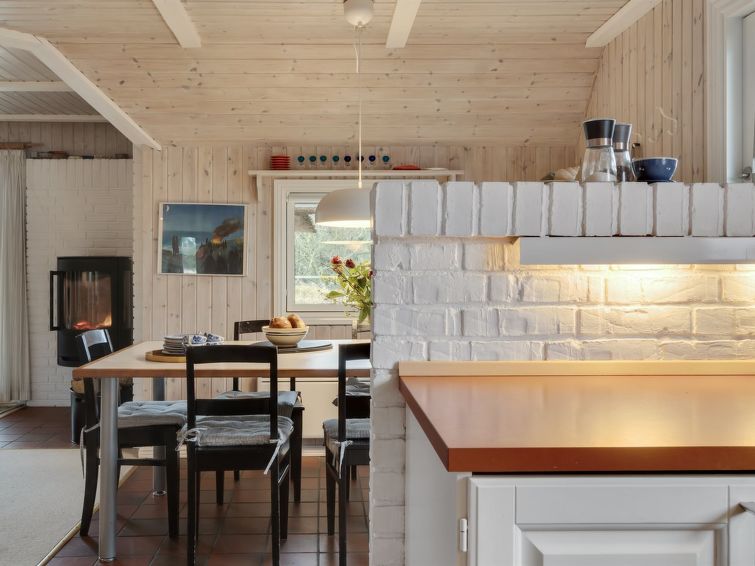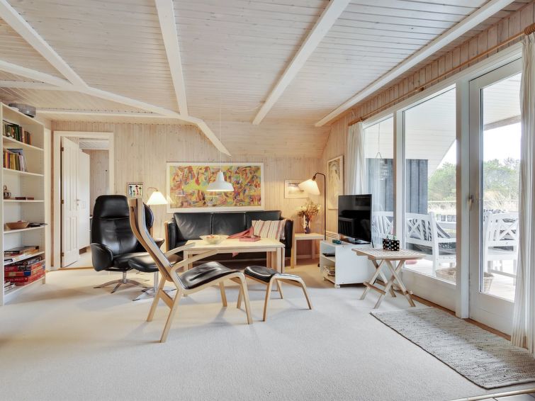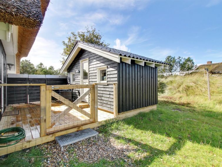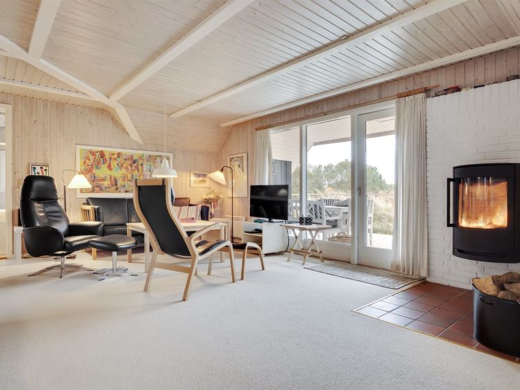 "Annli" - 1.5km from the sea in Western Jutland", 3 rom hus 72 m2. Passer for 6 voksne. Stue med, TV, CD-spiller, stereoanlegg og DVD. 1 rom med, 1 x 2 køysenger. 1 rom med 2 senger. Studio 1 rom med med 2 senger og 1 dobbeltseng. Kjøkken (4 kokeplater, stekeovn, oppvaskmaskin, mikrobølgeovn, frys). Dusj/WC. Terrasse 8 m2, dekt. Fasiliteter: Internett (trådløs LAN [WLAN]). Vennligst merk: røykfri bolig. Max kjæledyr / hund tillatt 1 kjæledyr / hund tillatt.
