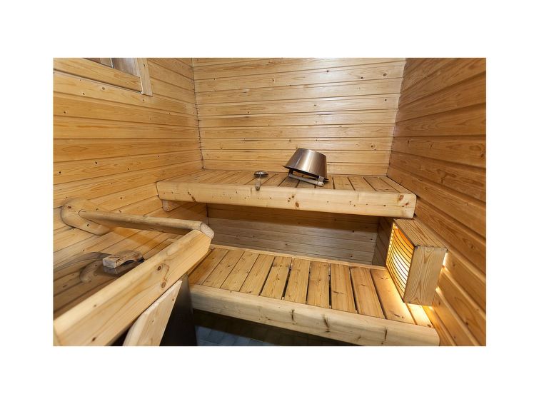 Living room/kitchen, downstairs bedroom with 2 beds, upstairs bedroom with 3 beds, upstairs lobby with 1 bed, sauna, washroom, 2 separate WCs, one upstairs. Balcony.