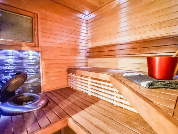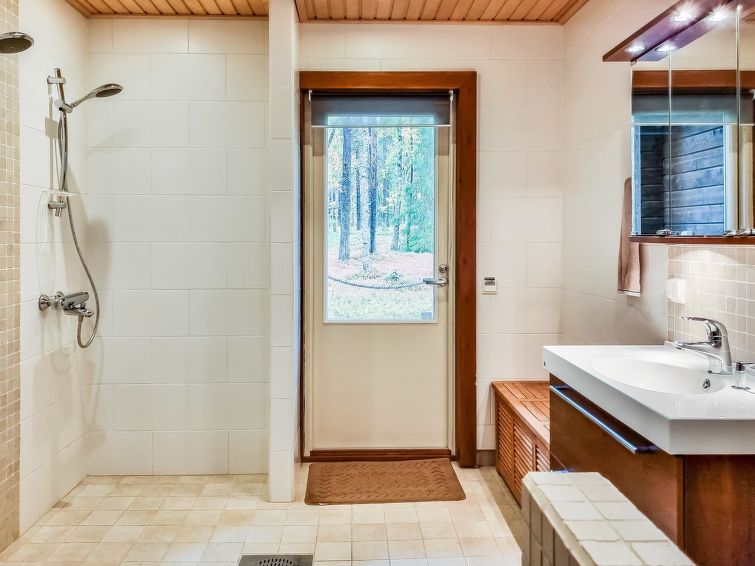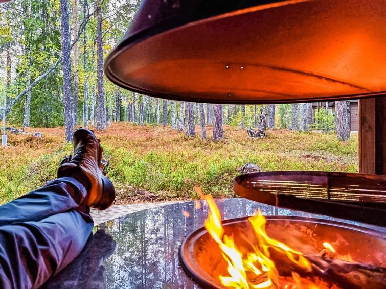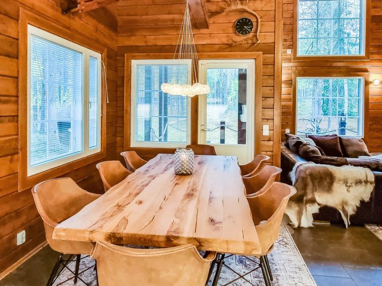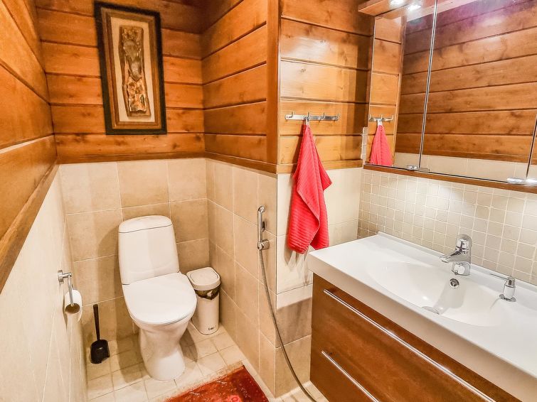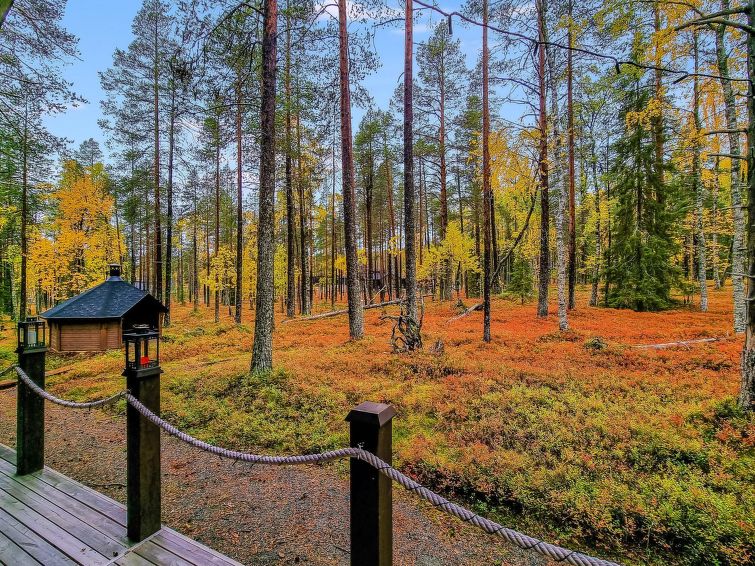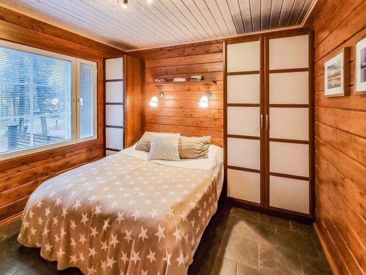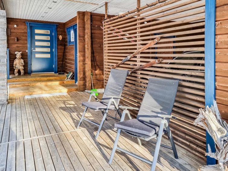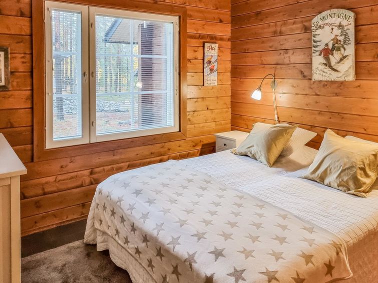 40 km north-east of Kolari, lake Ylläsjärvi 3 km, swimming beach 4,5 km. Separate wooden cottage, built 2007. Area 120 m² of which 15 m² on the loft. Well equiped kitchen, dining room and living room. Two bed rooms, one with two separate beds and one with two beds together. Loft with two separate beds and double bed. Glass wall separating loft and livingroom. 2 x TV. Electric sauna with instant stove, shower/toilet, separate toilet. Nursery equipment: feeding chair and travel bed. Storage room (20 m²) with car shelter and ski maintenance space.