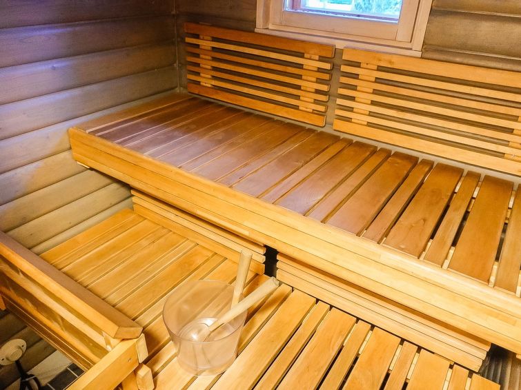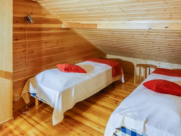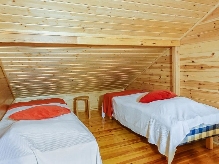Kitchen-living room, downstairs bedroom with two single beds, upstairs room with 2 single beds (steep stairs to upstairs/loft), a loft area with two single beds (beds can be moved, if necessary, to the upstairs spacious bedroom), sauna (electric stove), washroom / toilet, terrace.