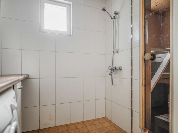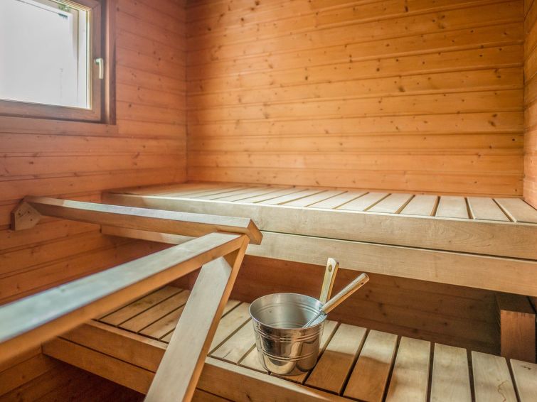 “Asterix” - an end apartment - is on 2 floors. Downstairs: bedroom 2 beds (including own clothes closet and flat screen TV), living room/kitchen, washroom, sauna (electric stove), WC and large terrace with garden furniture.