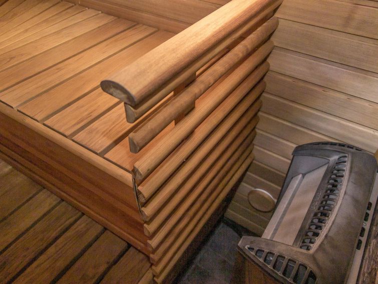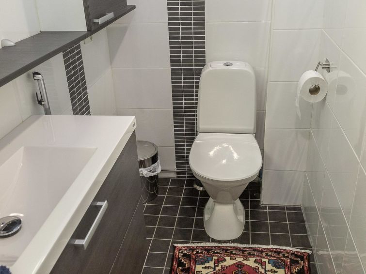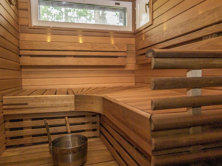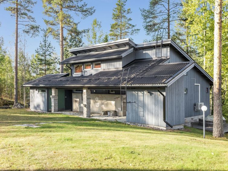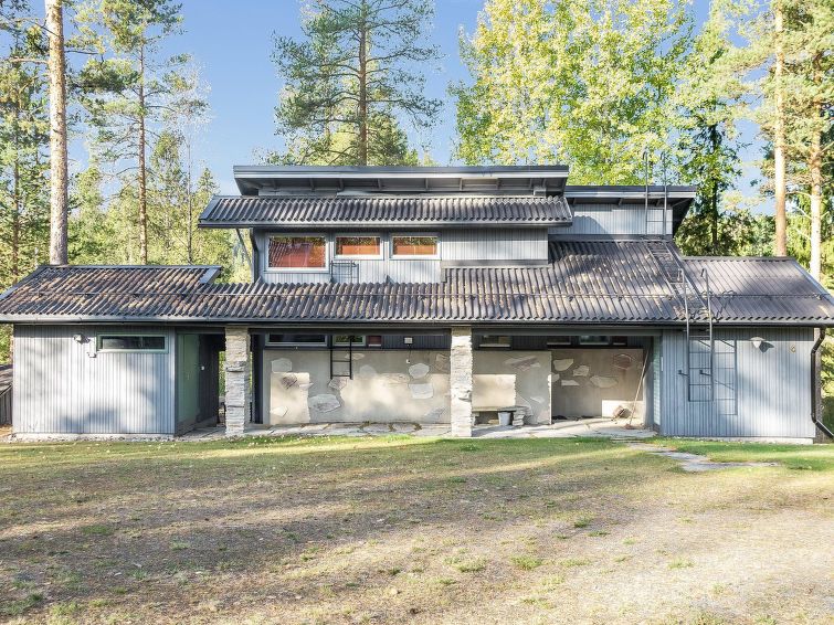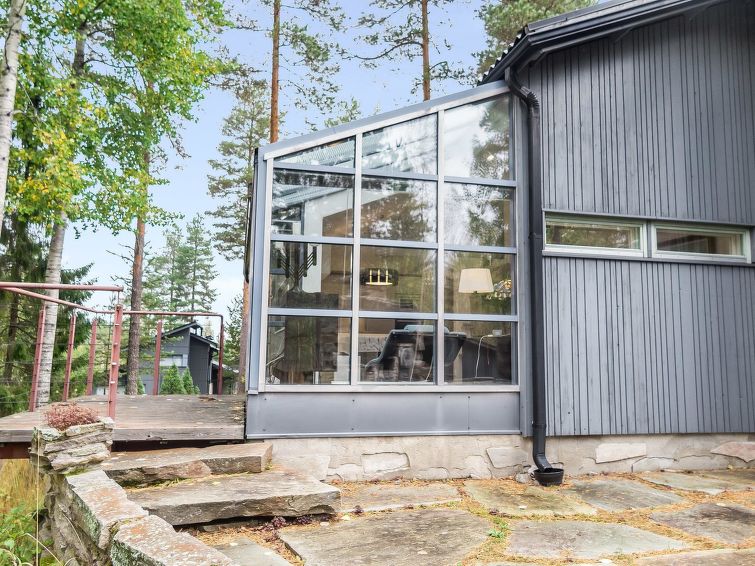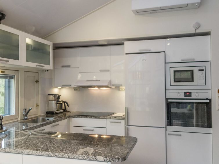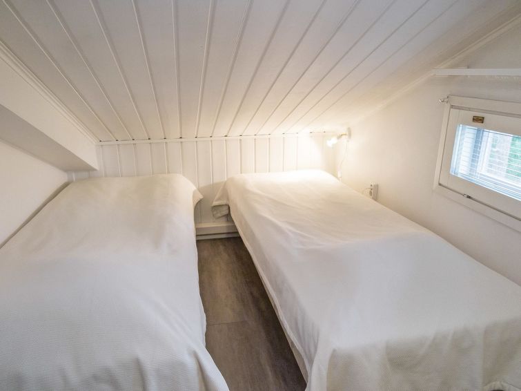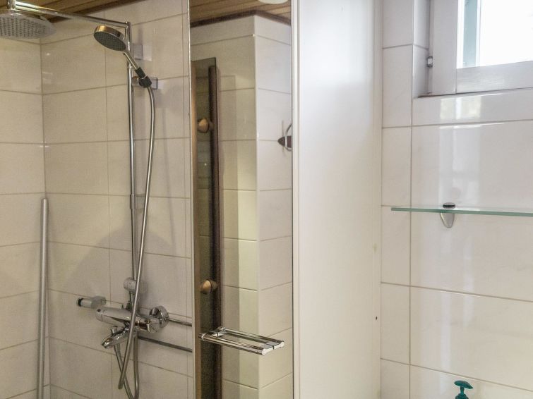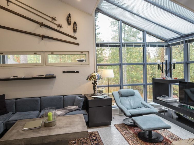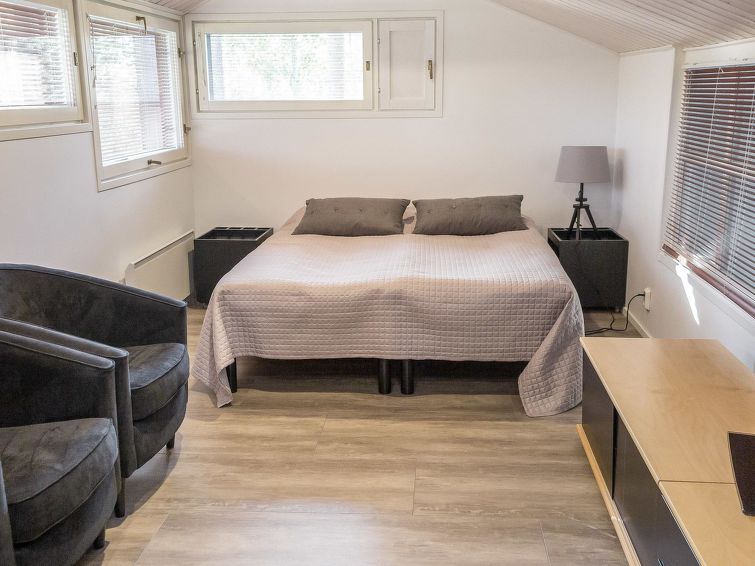65 km north-east of Kuopio, L.Syväri 400 m, shared shore 1.5 km, no boat. Wood/stone Atelje 4 chalet in heart of Tahkovuori Ski Centre, living room/kitchen, bedroom double bed, upstairs bedroom double bed and small bedroom 2 beds (access via large bedroom), washroom, sauna (electric stove), 2 porches. Cottage yard has permanent grill facility. High standard, comfortable atelier-style Atelje 4 holiday chalet in quiet area close to all Tahko resort services. On forested slope, view of slopes from chalet living room. Rented only to families or couples, not to young folk. Final cleaning included in prices.