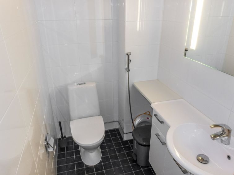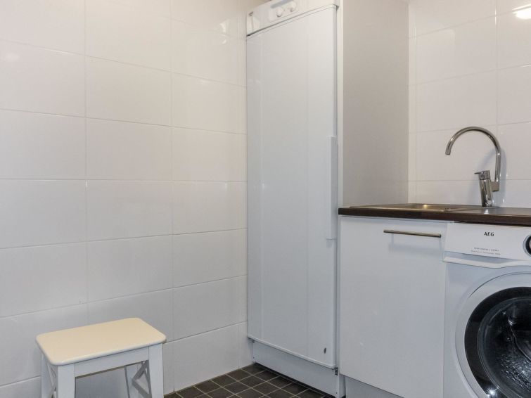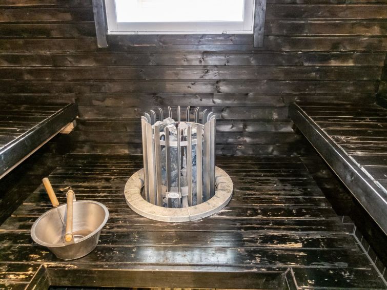Downstairs: living room/kitchen, bedroom with double bed, sauna (electric stove), washroom (2 showers), utility room, hall, WC and porch.