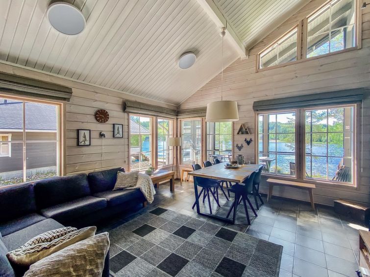 On the beach, a shallow sandy beach, a pier, a boat and a spacious barbecue hut for shared use. The glazed terrace offers a good view of the slopes of Ukkohalla and Lake Syväjärvi.