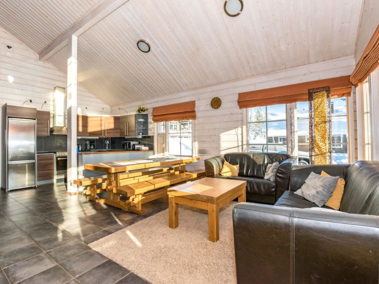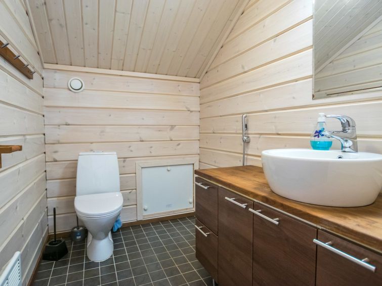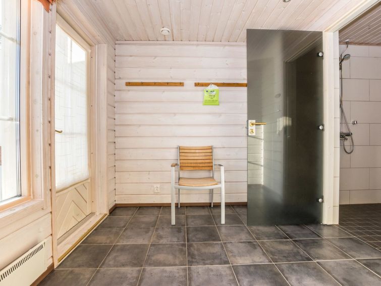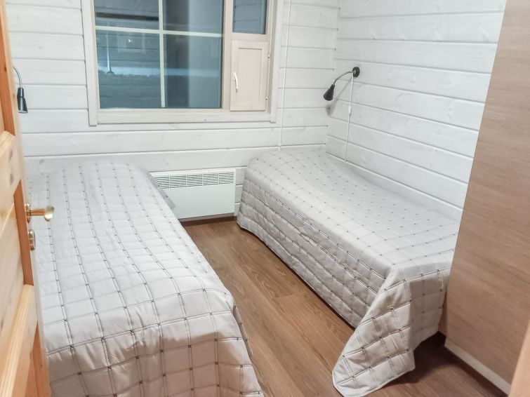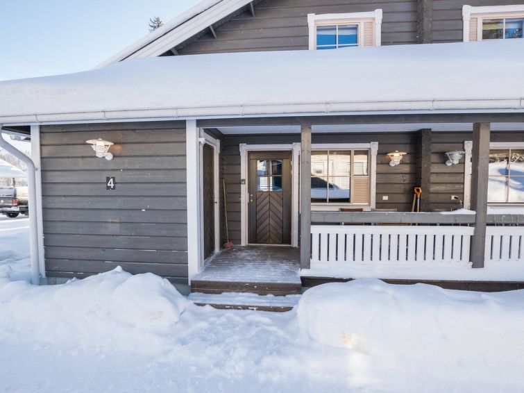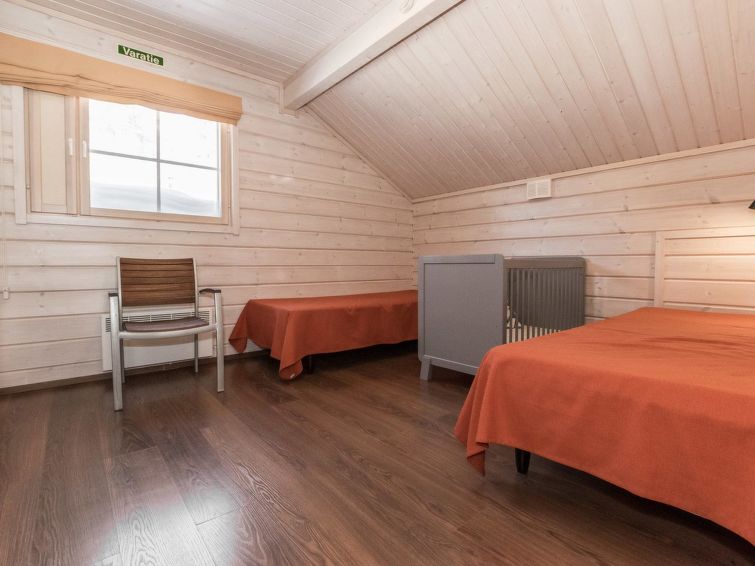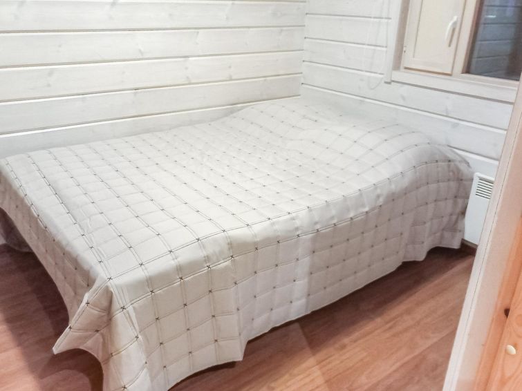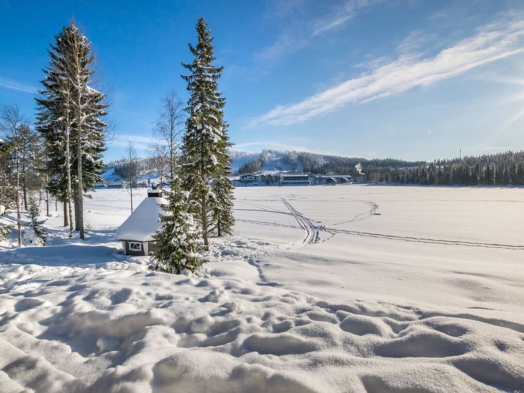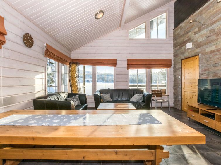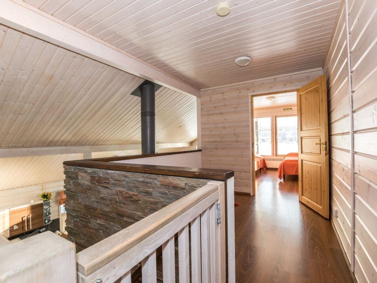A semi-detached house located in the Ukkohalla tourism centre, 150 m2, built in 2007. Kitchen, 5 bedrooms, loft, sauna, shower room/toilet, 2 separate toilets, dressing room, vestibule, terrace, storage, fireplace. Price includes firewood. 4 bedrooms with 2 x 80cm beds/room, 140cm bed in one of the bedrooms, 4 spare mattresses on the loft. A dock and a boat by the lake in shared use. Ukkohalla: Tourism centre located by Lake Syväjärvi, with an information centre, store, restaurant, spa, slope centre, snowmobile tracks, ski tracks, programme services, beach (further information at www.ukkohalla.fi). Distance to the Ukkohalla services 0.7 km. Kajaani airport 86 km, Oulu 170 km, Helsinki 650 km, bus stop Hyrynsalmi 18 km, railway station Kontiomäki 66 km. Beautiful view over the slopes and Lake Syväjärvi. Linen are forced 12€/person. 1.10.2014 Final cleaning includes to price.