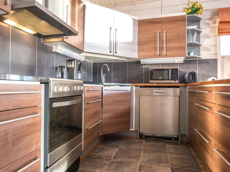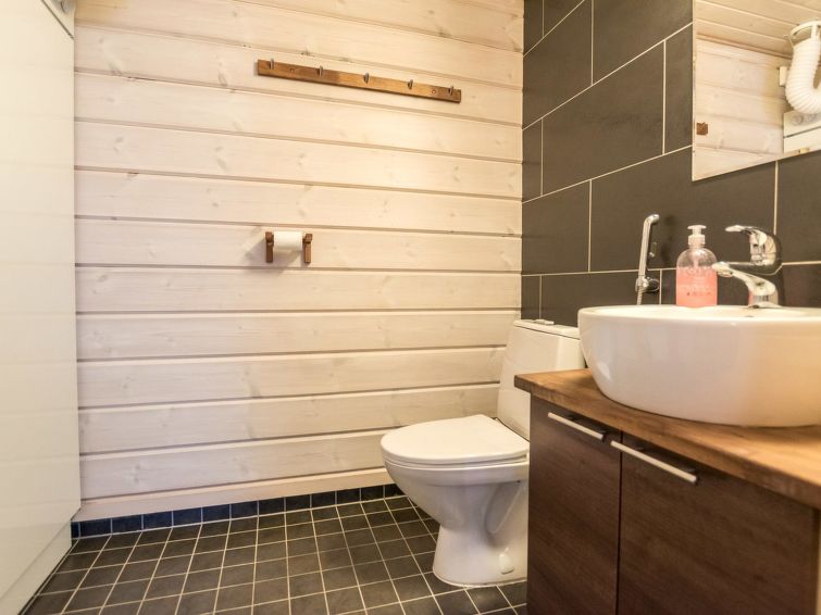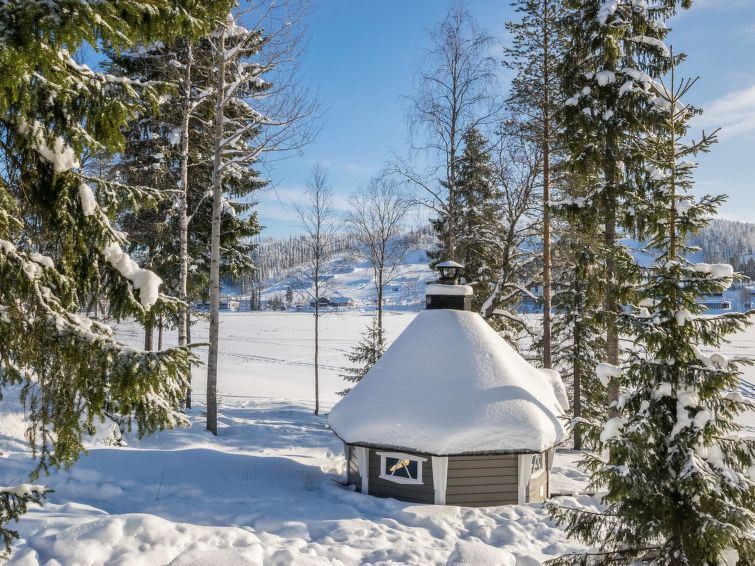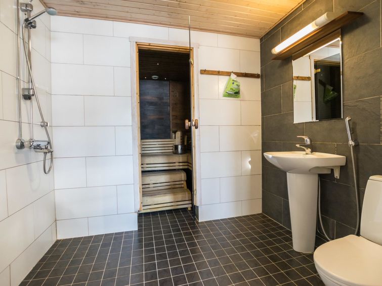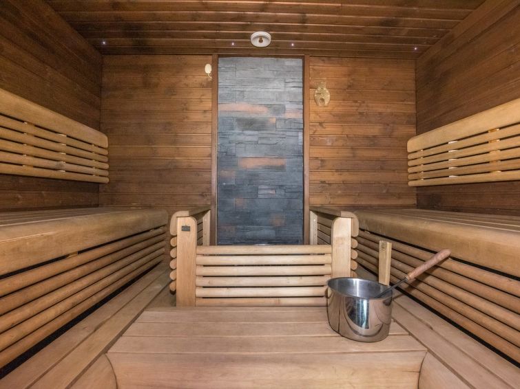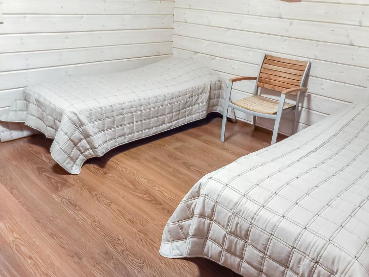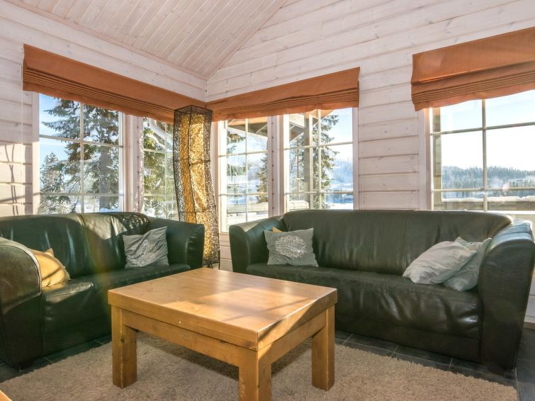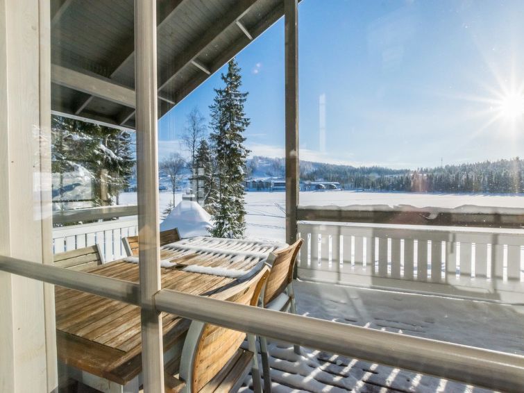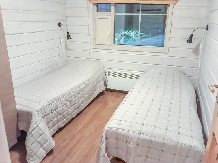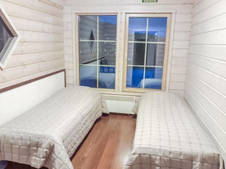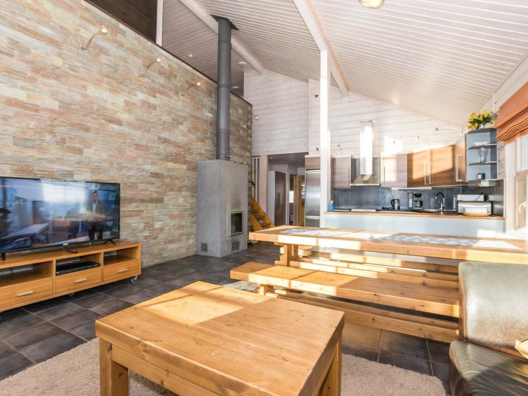 A semi-detached house located in the Ukkohalla tourism centre, 150 m2, built in 2007. Kitchen, 5 bedrooms, loft, sauna, shower room/toilet, 2 separate toilets, dressing room, vestibule, terrace, storage, fireplace. Price includes firewood. 4 bedrooms with 2 x 80cm beds/room, 140cm bed in one of the bedrooms, 4 spare mattresses on the loft. A dock and a boat by the lake in shared use. Ukkohalla: Tourism centre located by Lake Syväjärvi, with an information centre, store, restaurant, spa, slope centre, snowmobile tracks, ski tracks, programme services, beach (further information at www.ukkohalla.fi). Distance to the Ukkohalla services 0.7 km. Kajaani airport 86 km, Oulu 170 km, Helsinki 650 km, bus stop Hyrynsalmi 18 km, railway station Kontiomäki 66 km. Beautiful view over the slopes and Lake Syväjärvi. Linen are forced 12€/person. 1.10.2014 Final cleaning includes to price.