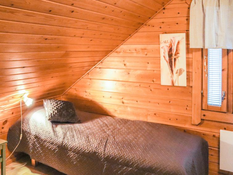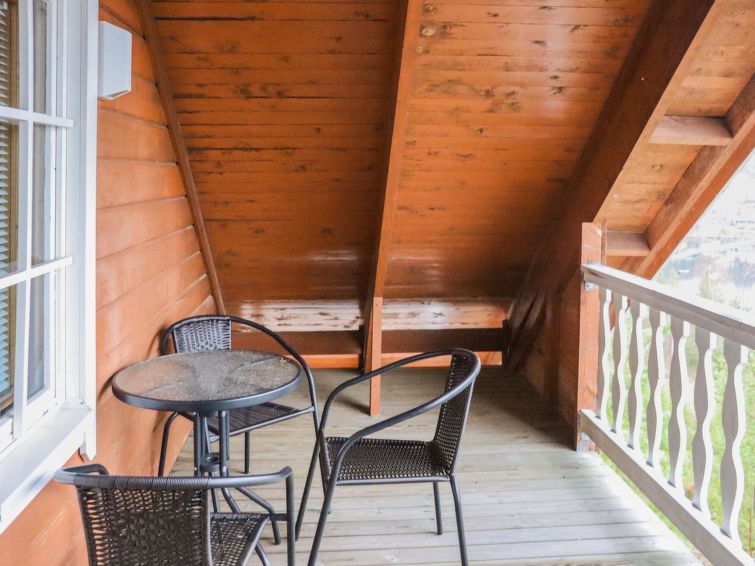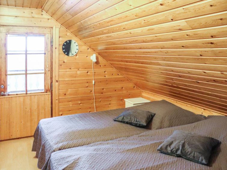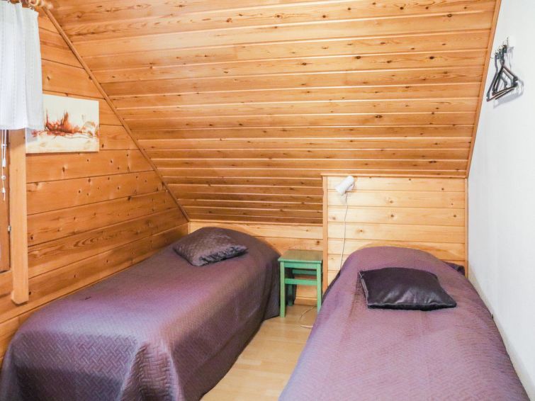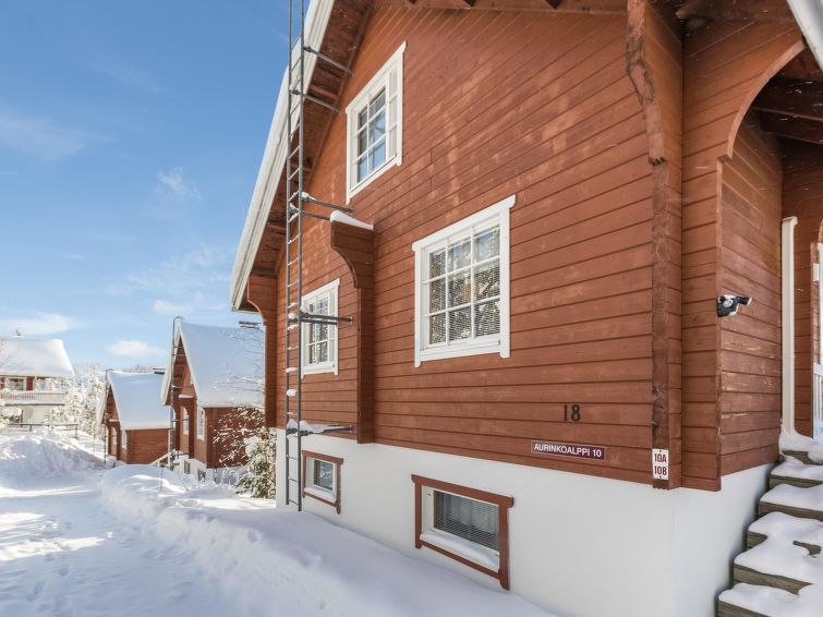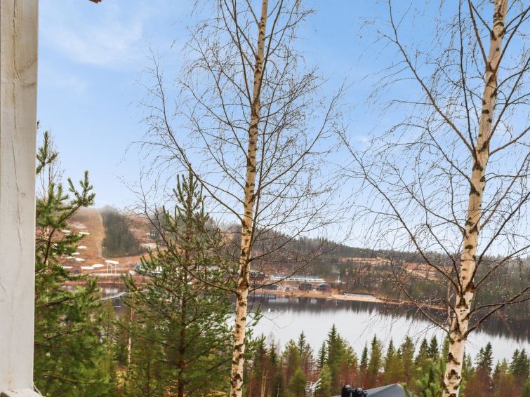 The upstairs of a semi-detached house located in the Ukkohalla tourism centre, 75 m², built in 1990, renovated in 2000, kitchen, 3 bedrooms, sauna, shower room, 2 separate toilets, balcony, terrace, fireplace, firewood, a double bed in the bedroom downstairs, upstairs 4 beds in one bed room and two beds in other bed room, a sofa-bed in the living room.