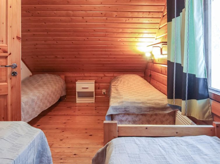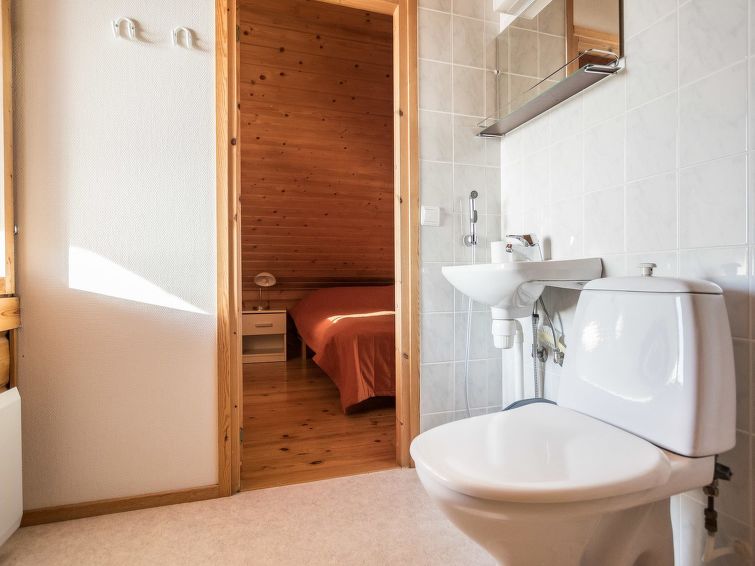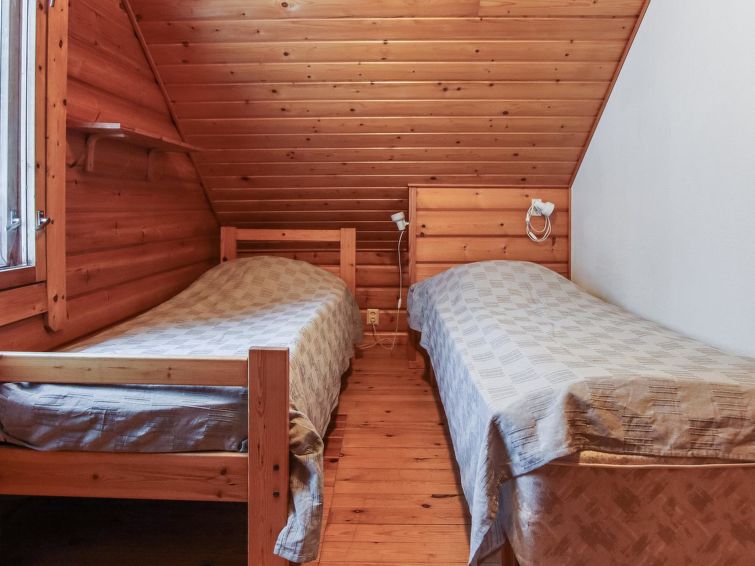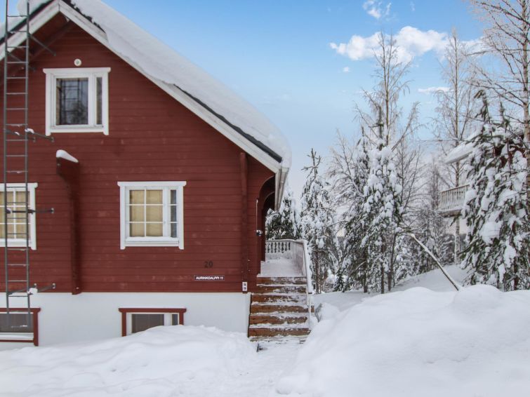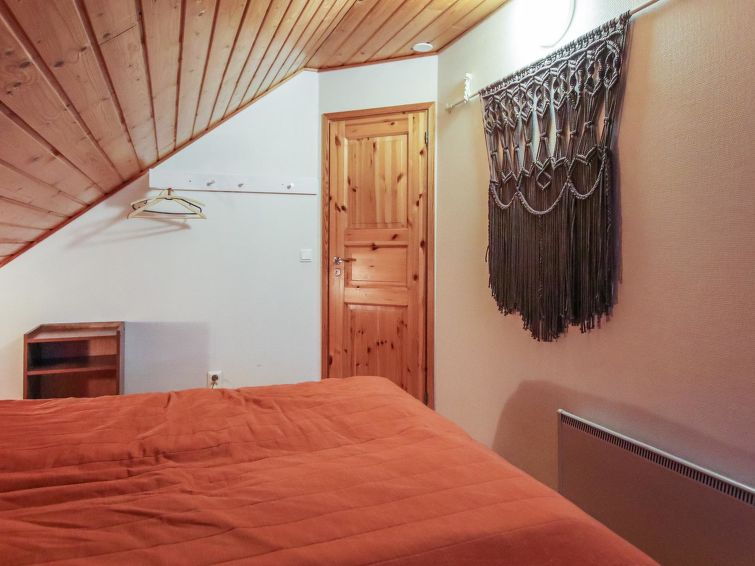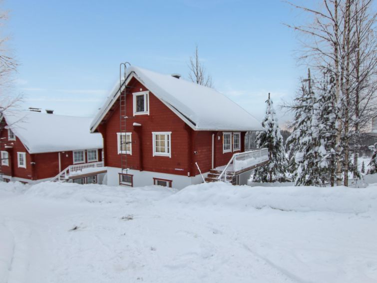 The upstairs of a semi-detached house in the Ukkohalla tourism centre, 8 persons, 75m2, built in 1990, renovated in 2000, kitchen, 3 bedrooms, sauna, shower room/toilet, separate toilet upstairs, balcony, terrace, fireplace, double bed in the bedroom downstairs, 4 beds upstairs bedroom number one and another bedroom doublebed.