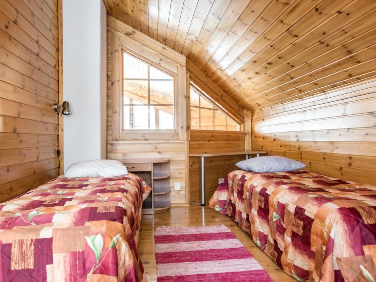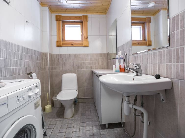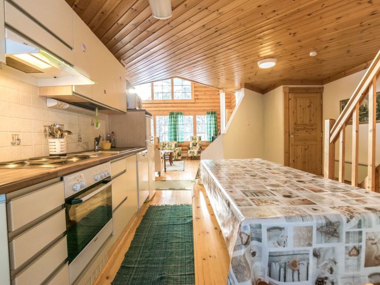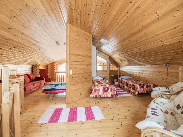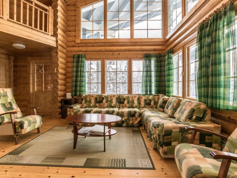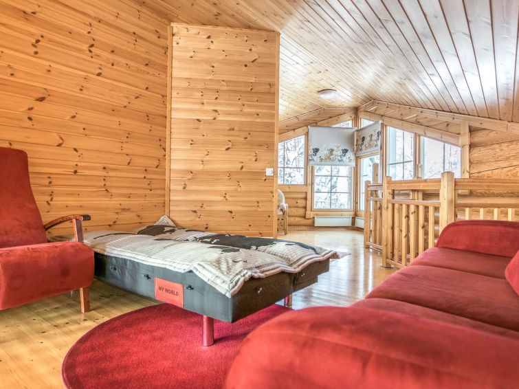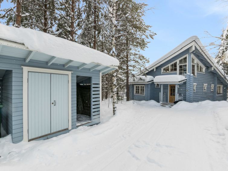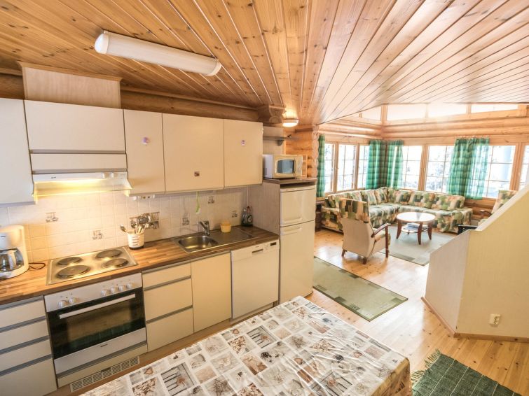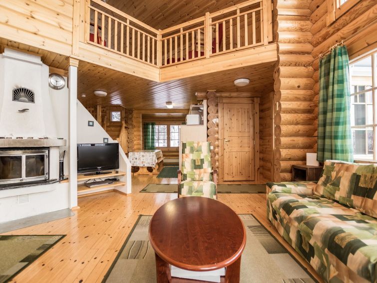 A log cottage located in the Ukkohalla tourism centre, 128m2, built in 2006. Kitchen, 2 bedrooms, loft, sauna, shower room/toilet, separate toilet, vestibule, terrace, fireplace. A sofa-bed and two beds on the loft. An outdoor grill in summer use, WiFi.