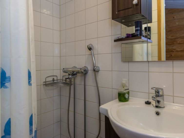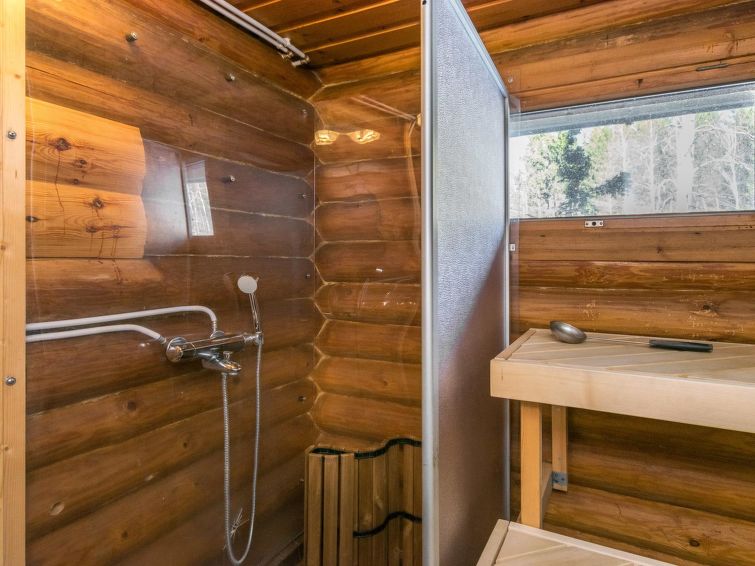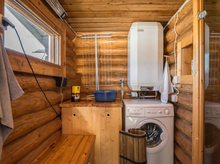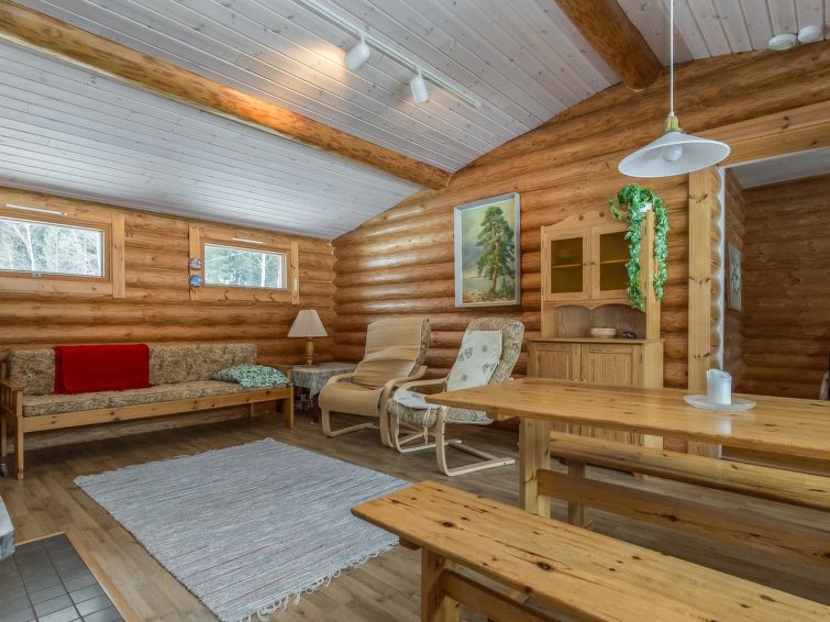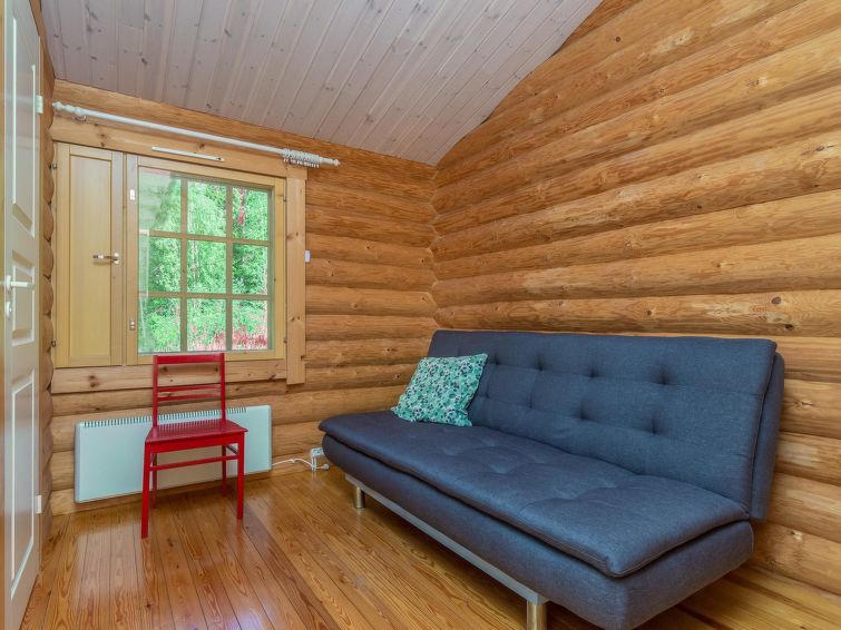 Log cabin 1977, extended 1993, renovated 2013, kitchenette, living room with 130 cm wide spreadable bed (while spread, there is space for two), bedroom (12.5 m²) with double bed, another bedroom (10 m²) with spreadable sofa (while spread, there space for two), washroom with shower and WC, covered terrace. Another entrance to the bedroom and washroom is through the first bedroom.