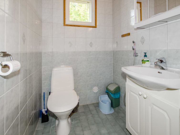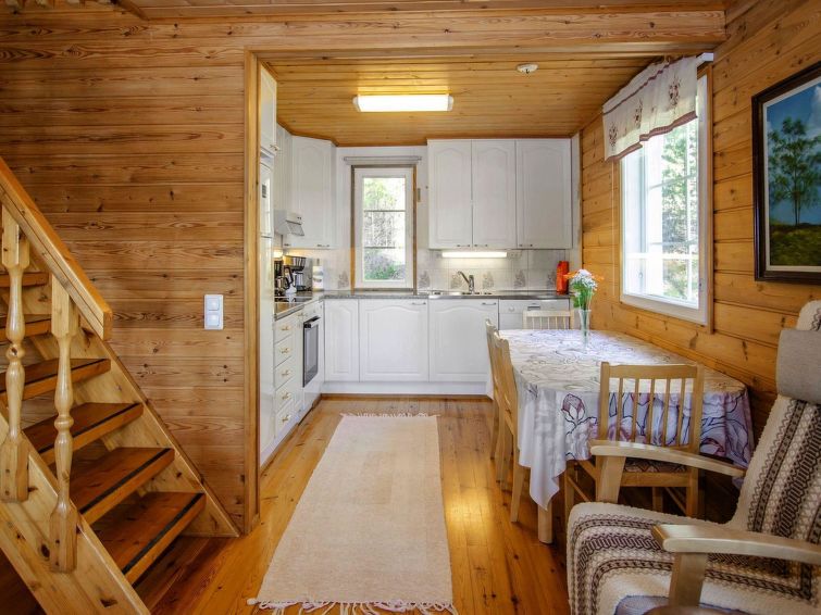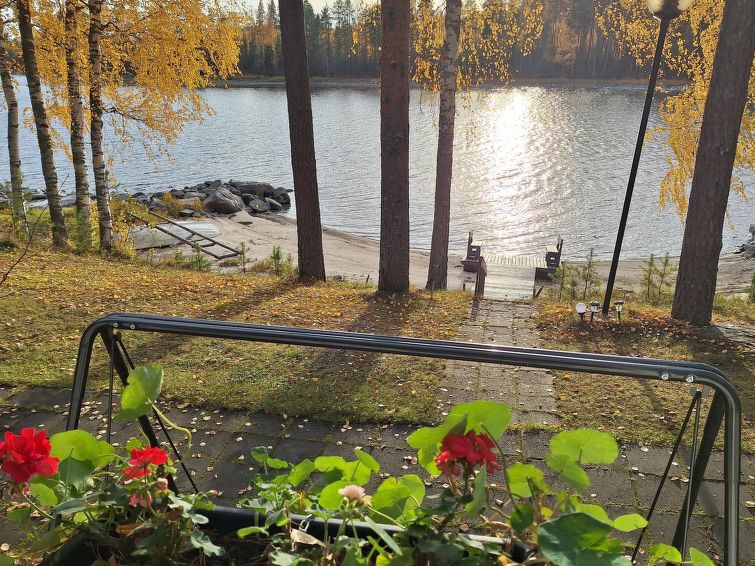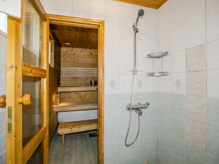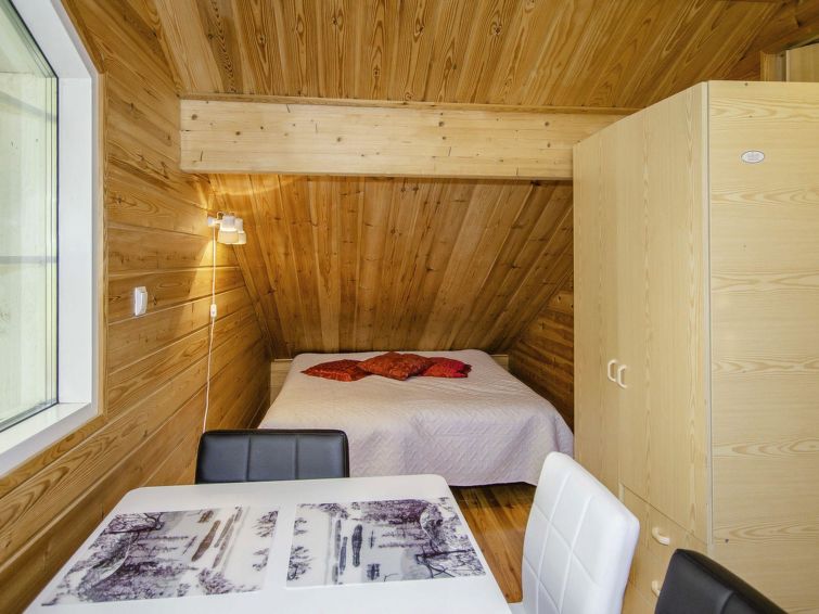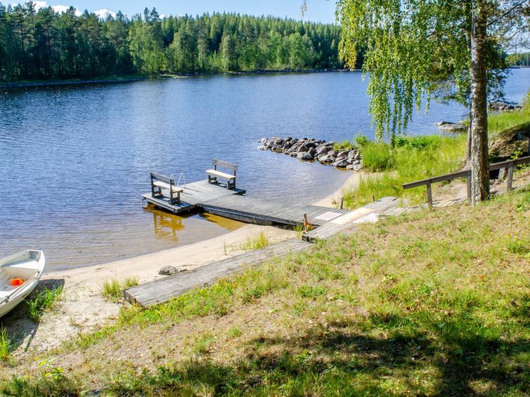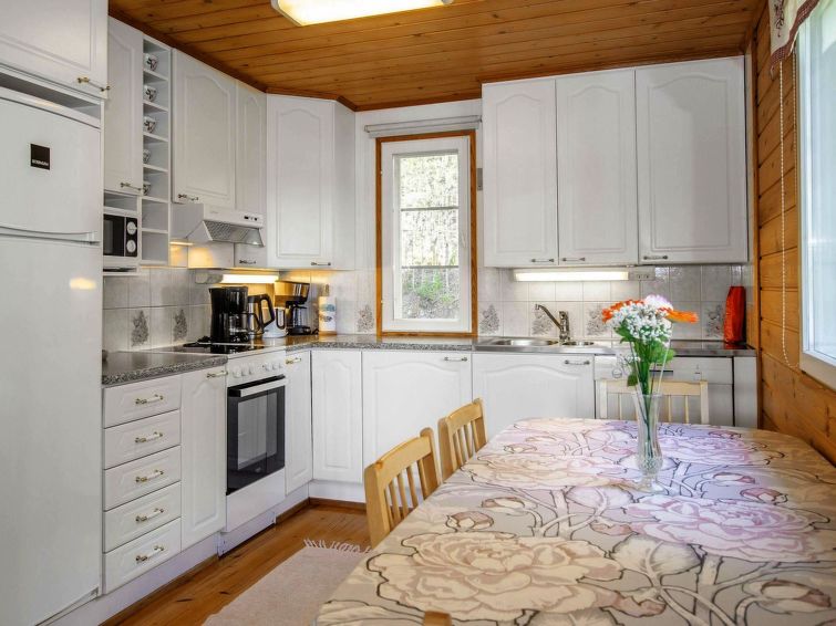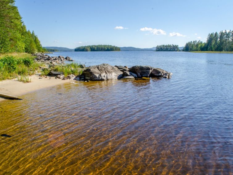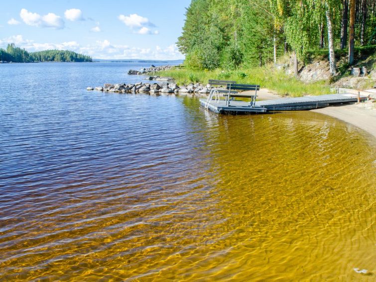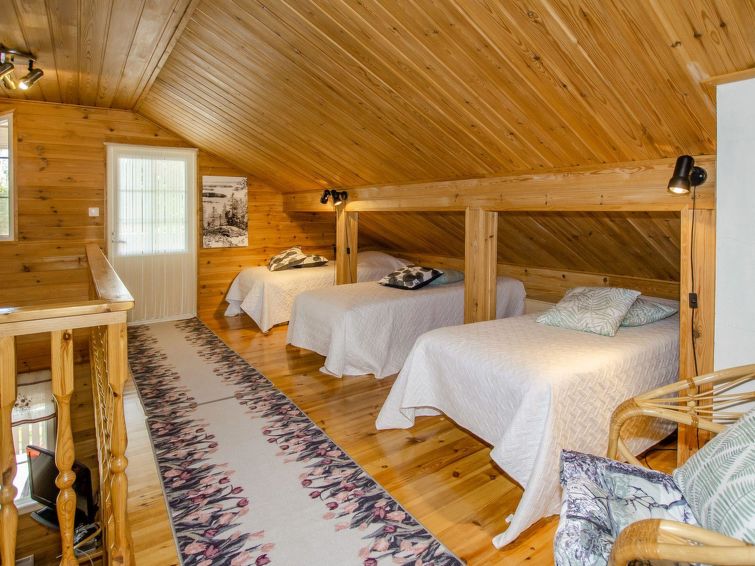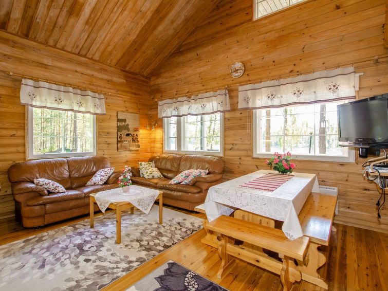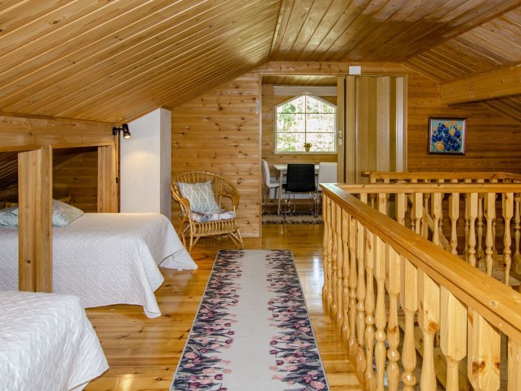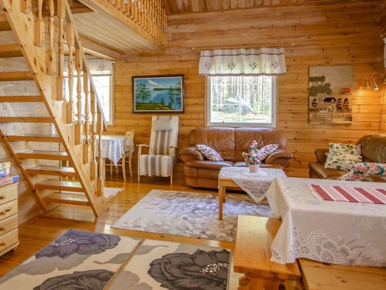 106 m2 cottage by lake Pielinen in Hattusaari for max 8 persons, totally 2 bed rooms. Bedroom downstairs with double bed, sleeping gallery (3 beds); bedroom upstairs with sliding door (2 beds + 120 cm bed), kitchen, living room, toilet, changing room, shower room, sauna. Holiday cottage 1998 on a peaceful place in Hattusaari by lake Pielinen. Own shore with shallow sandy bottom in the beginning, but then deepens, own boat and jetty. Outdoor grill and swing in the yard. Fireplace, sauna with electrive stone, washroom with underfloor heating. To Koli village 17 km, to Ukko-Koli ski slopes 19 km.