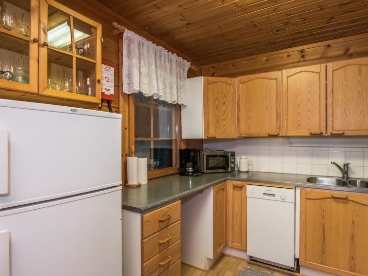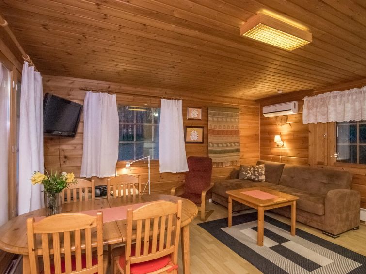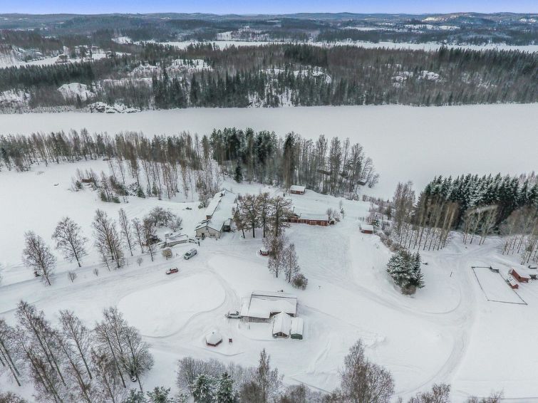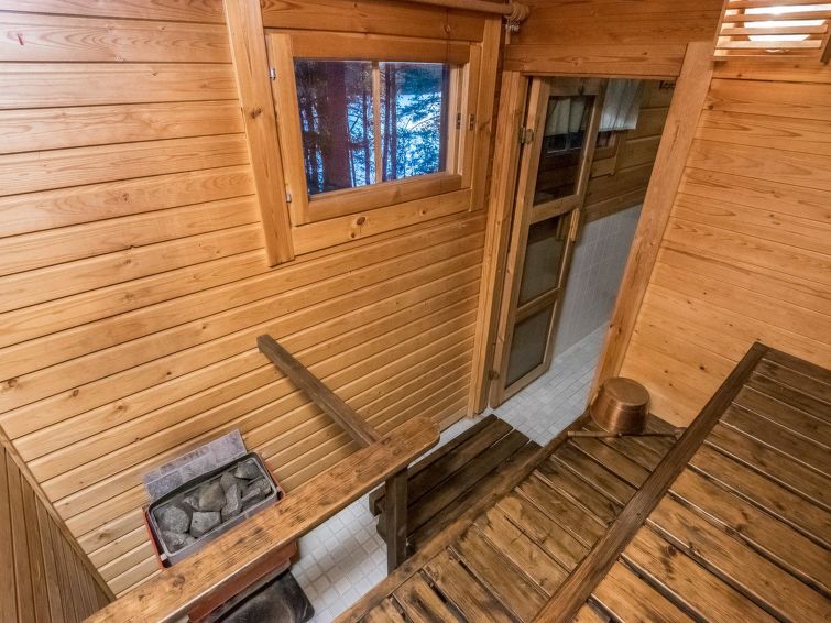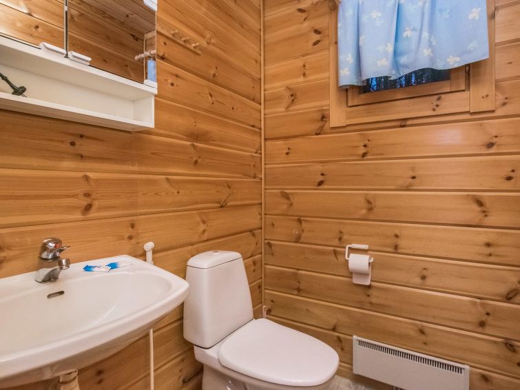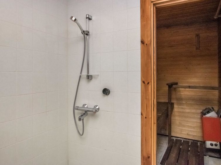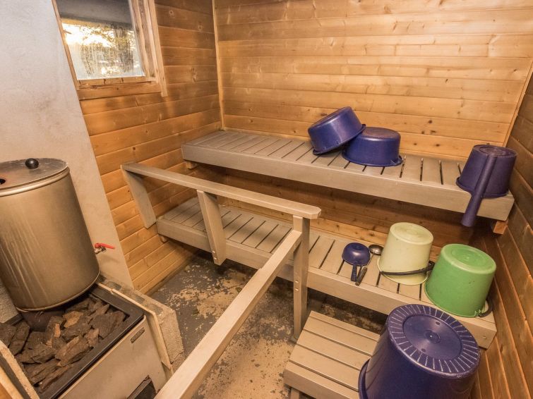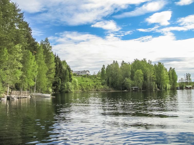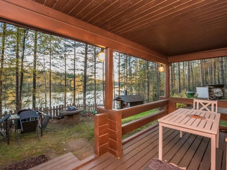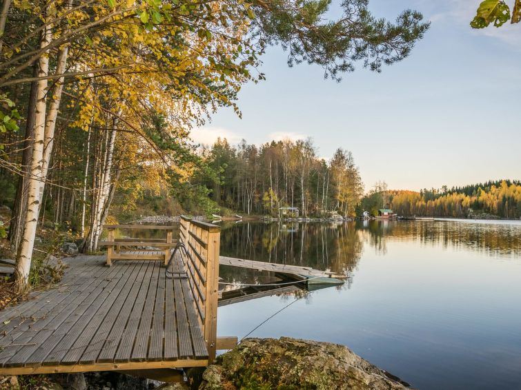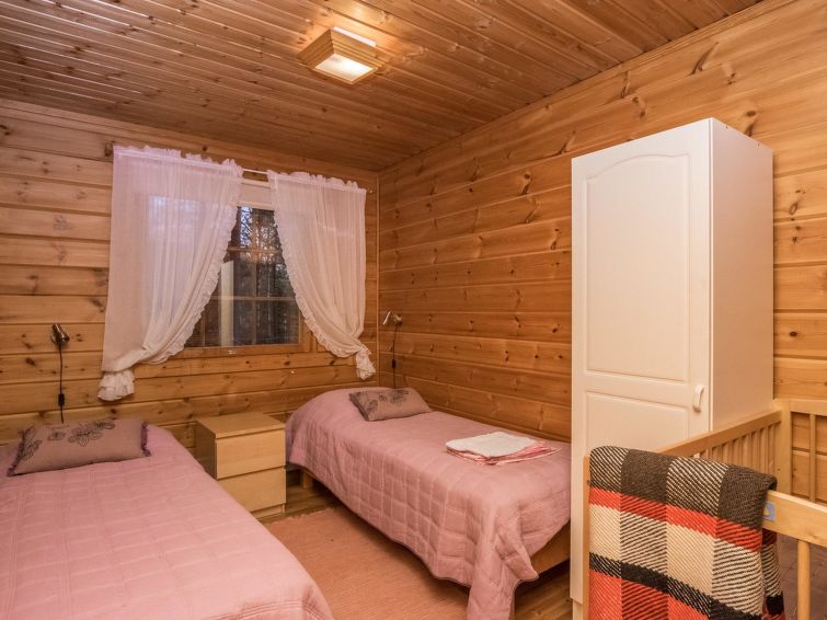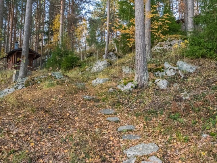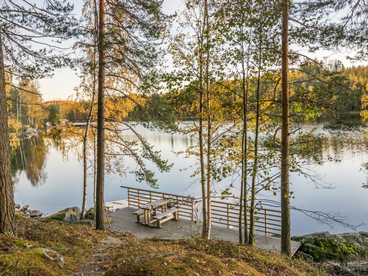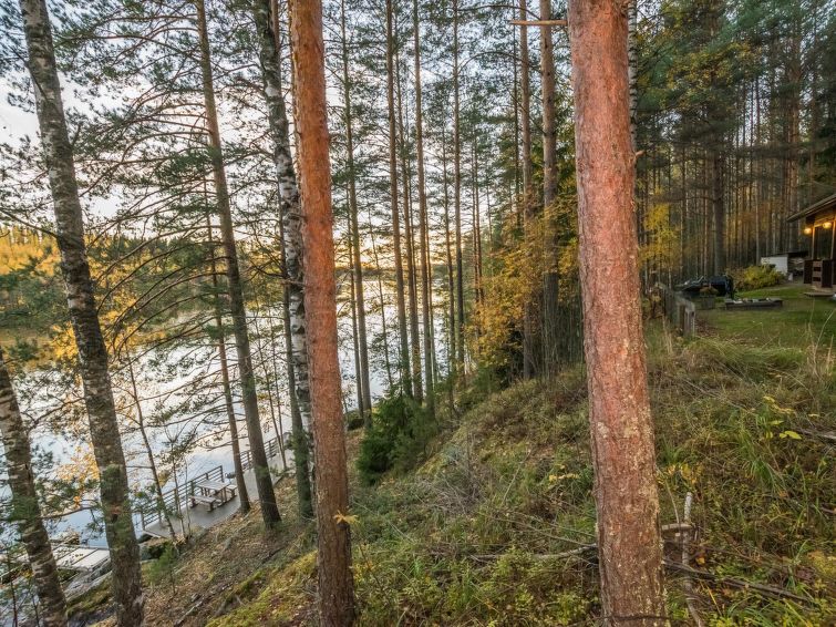 56 km south of Savonlinna. Lake Saimaa/Pihlajavesi 25 m, reasonably deep water, firm sanded bottom. Own boat. Log cabin 1994, living room/kitchen with sofabed, bedrooms with double bed, bedroom with 2 beds, washroom, dressing room, sauna (elec. sauna stove), open veranda. Lakeside sauna 10 sqm (heated by wood). A steep slope from cottage to beach.