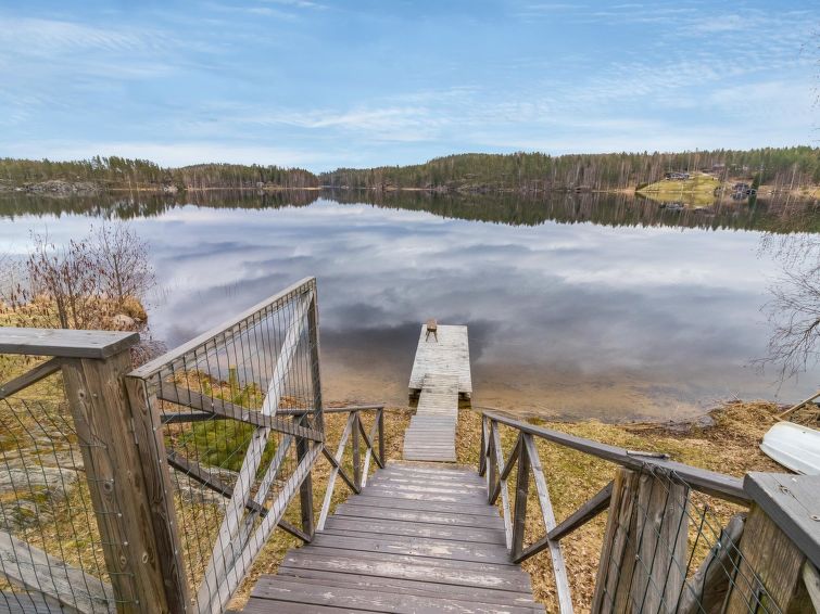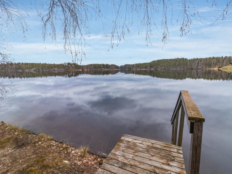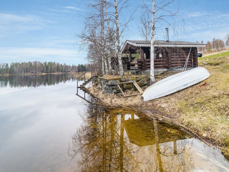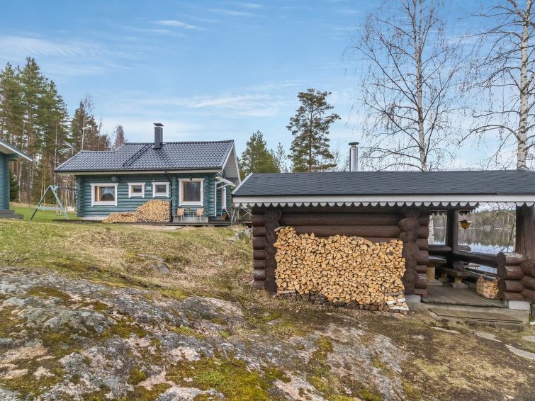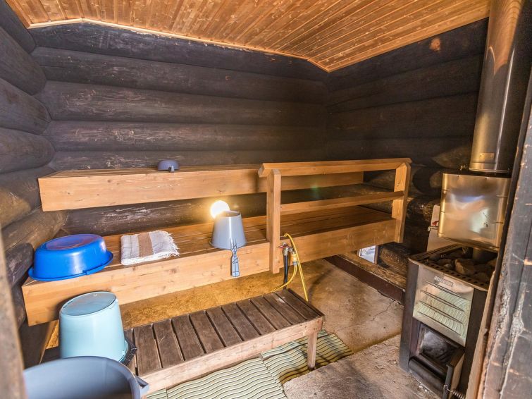 Log lakeshore sauna (6 m2) 1995, renovated 2011, wood-burning stove and hot water tank on stove, porch, electric light, water from well in summer, distance from shore approx. 5 m.