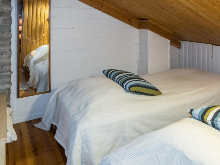 In the loft, there are two sleeping alcoves, each equipped with two beds. Please note that the stairs leading to the loft are steep. The loft area spans 8 m2 with a maximum height of 1.7 m.