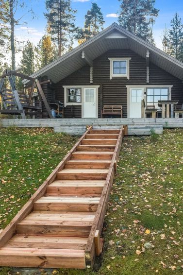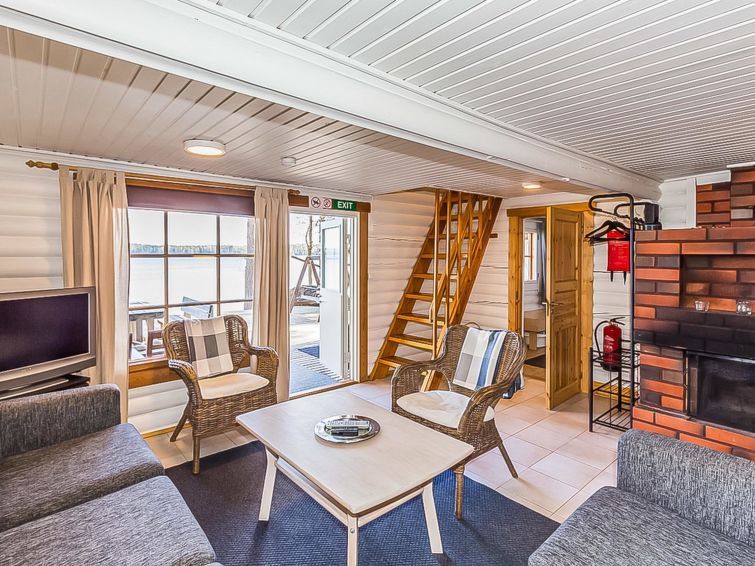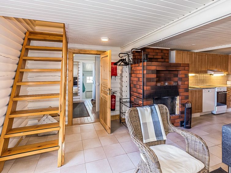 Log cabin 1986, extended and renovated 2008, downstairs bedroom with 2 beds (width 90 cm) and under the beds 2 extra beds (width 70 cm), living room/kitchen with convertible sofa, dressing room, sauna, open veranda. Upstairs bedroom with 2 beds (width 90 cm) and sitting area with 1 bed (width 90 cm). Upstairs with sloping ceilings, partly with low room height (maximum heigth 200 cm).
