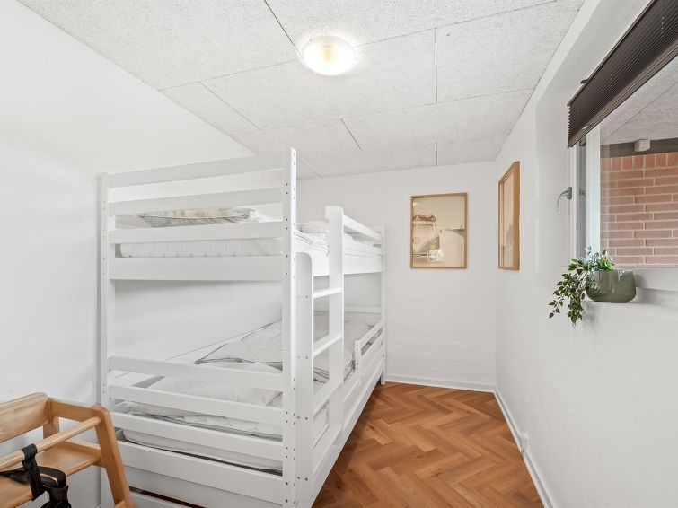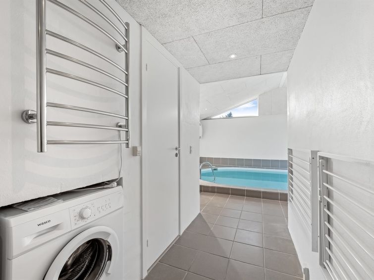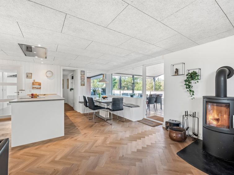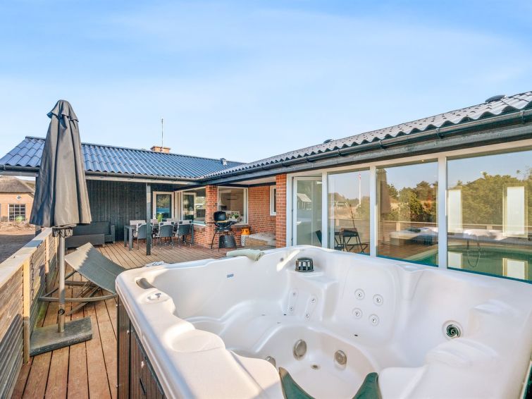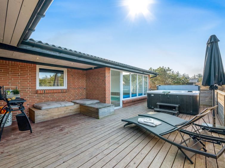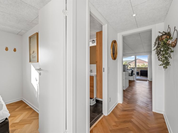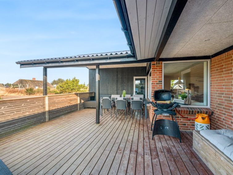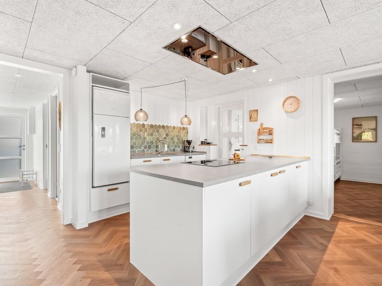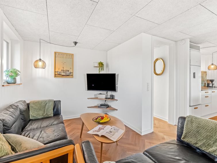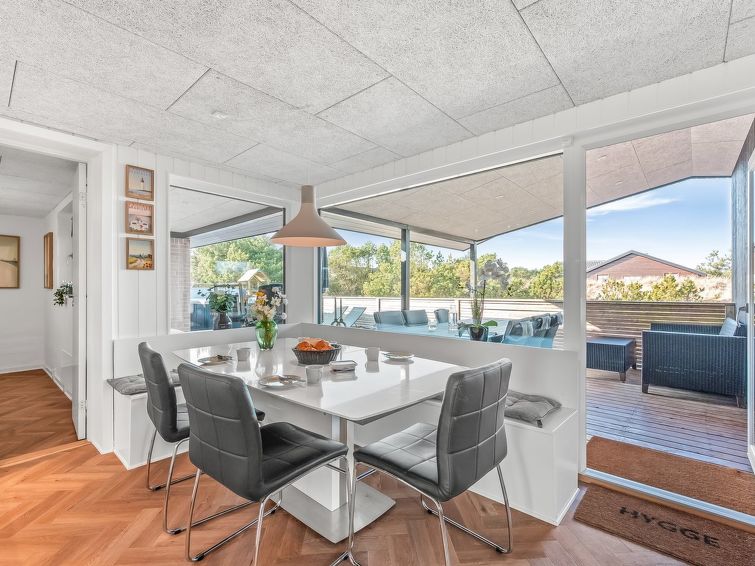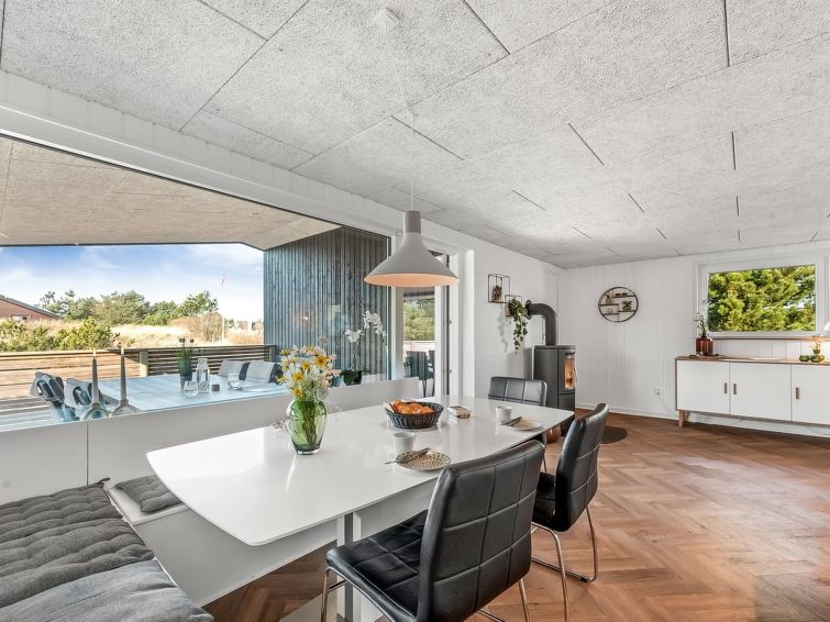 "Bela" - from the sea in Western Jutland", 3 rom hus 124 m2. Passer for 6 voksne + 1 barn. Stue med, TV, stereoanlegg og DVD. 1 rom med, 1 dobbeltseng. 1 rom med, 1 x 2 køysenger. 1 rom med, 1 dobbeltseng. 1 rom med, 1 dobbeltseng. Kjøkken (stekeovn, oppvaskmaskin, 4 induksjonskomfyr, mikrobølgeovn, frys). Dusj/WC. Terrasse 20 m2, dekt. Fasiliteter: høy barnestol barneseng (ekstra). Internett (trådløs LAN [WLAN]). Vennligst merk: røykfri bolig. Max kjæledyr / hund tillatt 1 kjæledyr / hund tillatt.