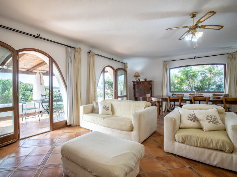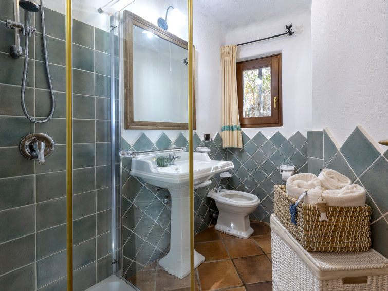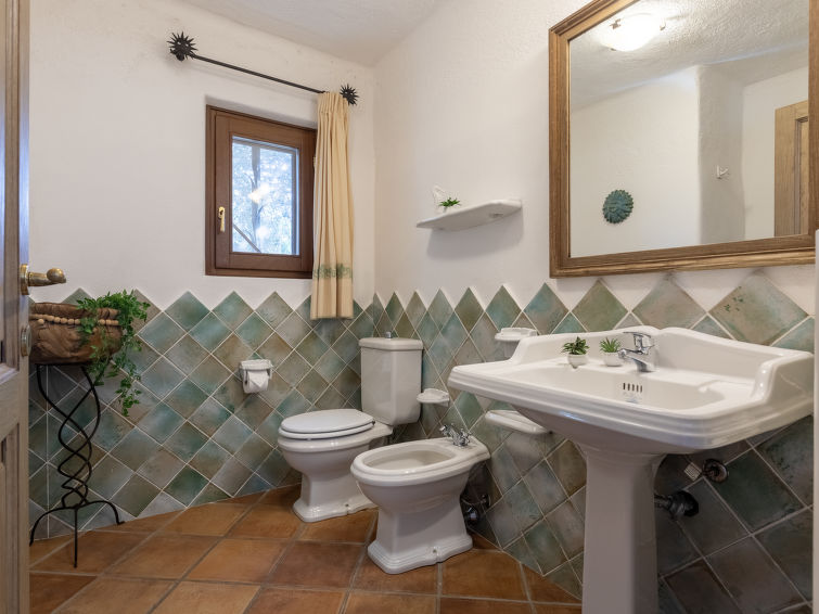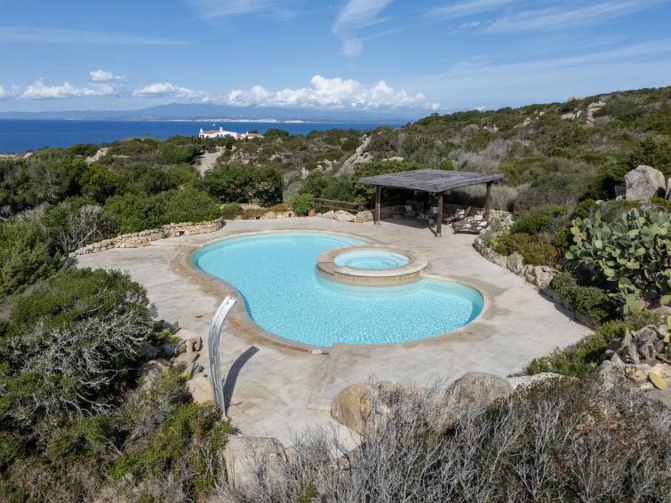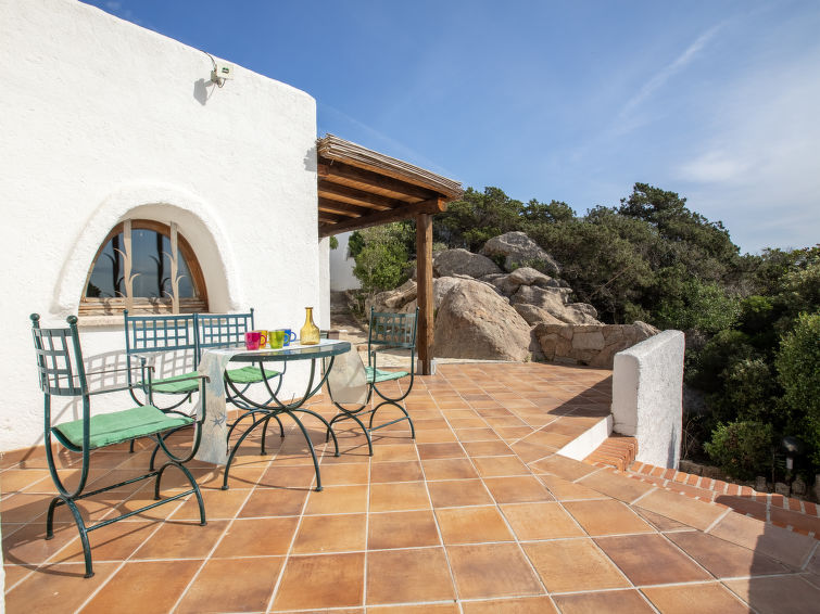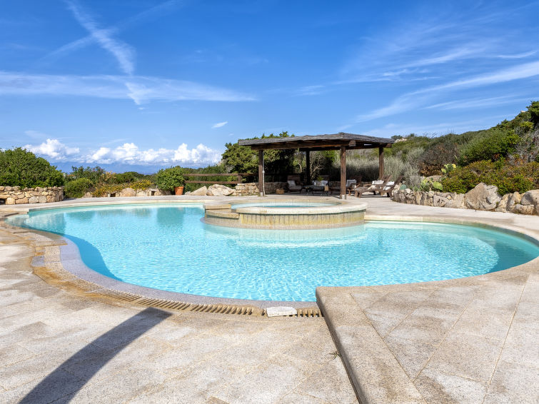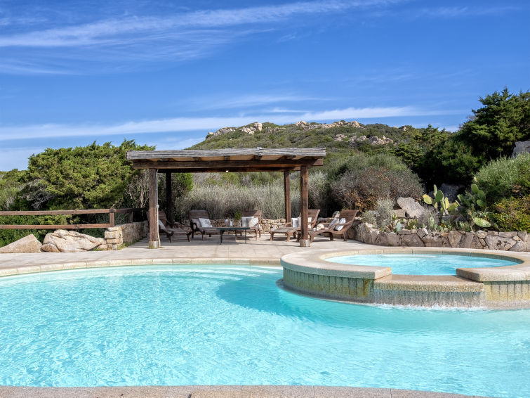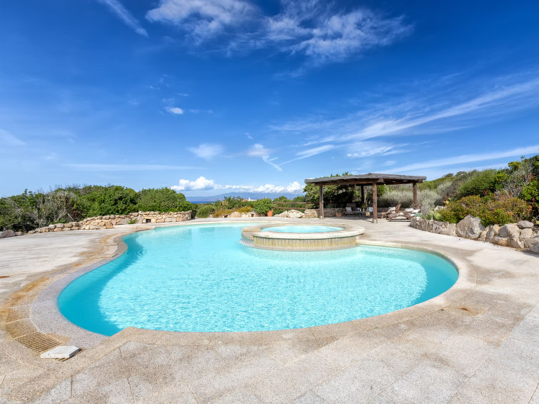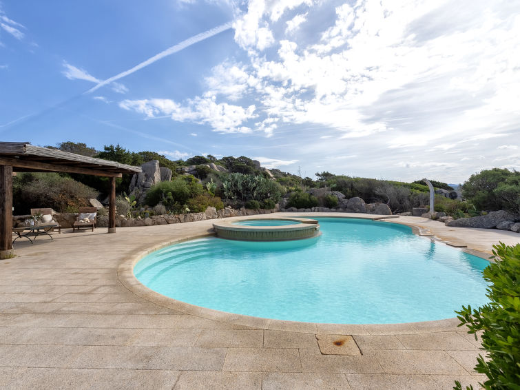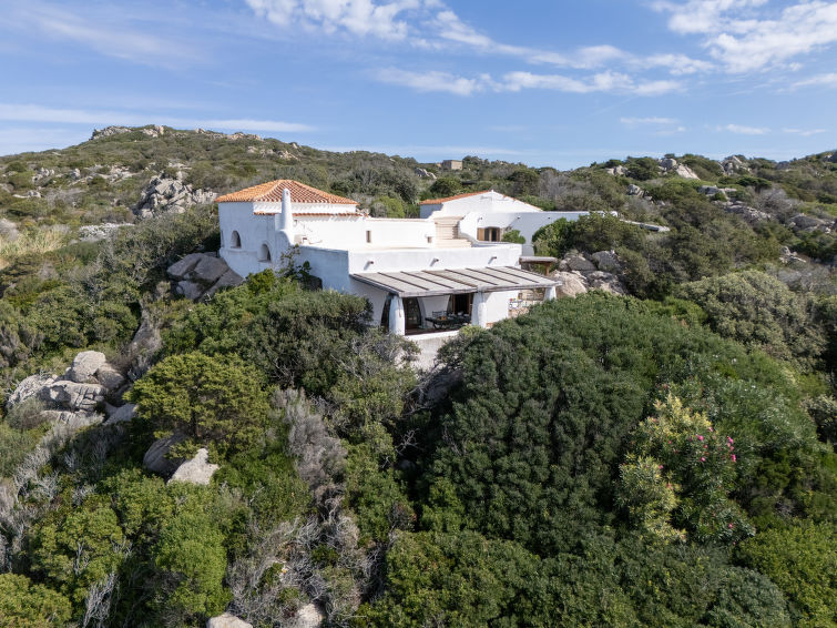 Fin villa "Bianca", frittstående. Eiendom bestående av hovedhus og uthus, i området Terravecchia 2 km fra sentrum av Santa Teresa, 24.5 km fra sentrum av Palau, 61 km fra sentrum av Olbia, i en solrikt, høyt posisjon på toppen av en høyde, 1.5 km fra sjøen, i det grønne. Privat: stor hage i flere nivåer m2 5'000 ha (uten gjerde) med planter og trær, svømmebasseng nyre-formet (10 x 4 m, dybde 130- 200 cm dyp, Sesongåpent: 01.Apr. - 31.Okt.). Utendørs dusj, boblebad, pergola, terrasse, hagemøbler, grill. I huset: vaskemaskin. 40 m lang ujevn Tilgang med bil hele veien til hbrukt (naturvei). Trapper til hbrukt. Parkering på tomten. Supermarked 2 km, restaurant 1.5 km, ferje "Olbia" 68 km, sandstrand "Rena Bianca" 4 km, badebukt 1.5 km. Marina 1.5 km. Vennligst merk: bil anbefales.
