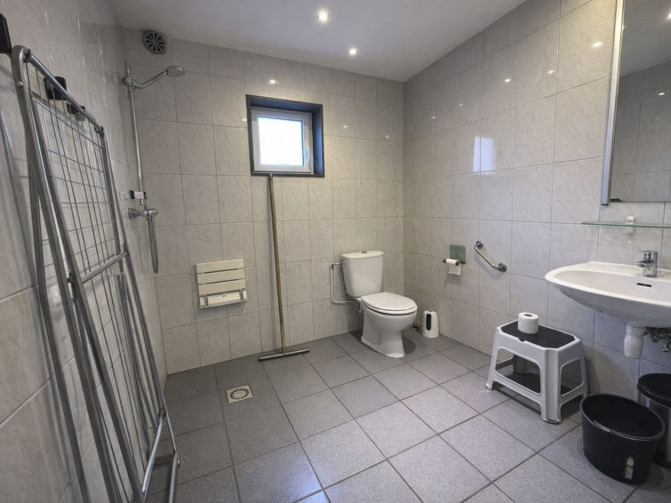 "Geschakelde 15 persoons", 5 rom hus 180 m2 på 2 etasjer. Praktiskt møbler: inngang. Stue/spisestue med, spisebord, TV og vedovn. Utgang til terrassen. 2 dobbelt rom, hvert rom med 2 senger. Åpent kjøkken (8 kokeplater, oppvaskmaskin, vannkoker, elektrisk kaffemaskin, kombinert mikrobølgeovn). Dusj/WC. Oppvarming. øverste etasje: 4 dobbelt rom, hvert rom med 2 senger. 1 rom med 3 senger. 2 dusjer, sep. WC. Terrasse. Terrassemøbler. Fasiliteter: Internett (trådløs LAN [WLAN], gratis). Vennligst merk: max kjæledyr/små hunder tillatt 2 kjæledyr/små hunder tillatt. Røykvarsler.