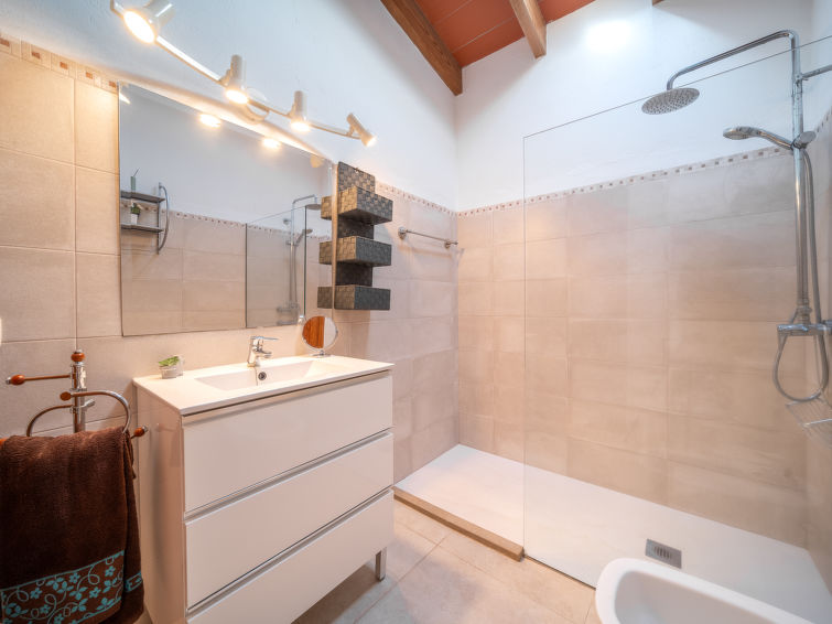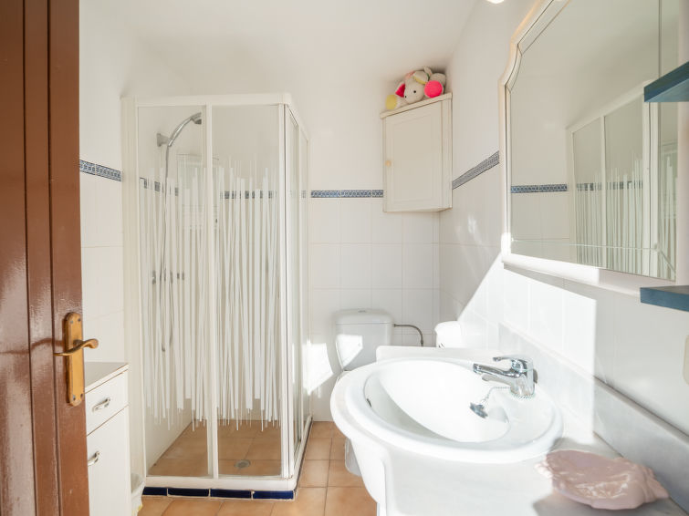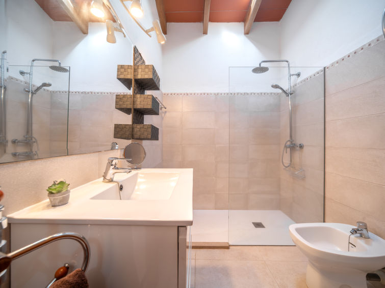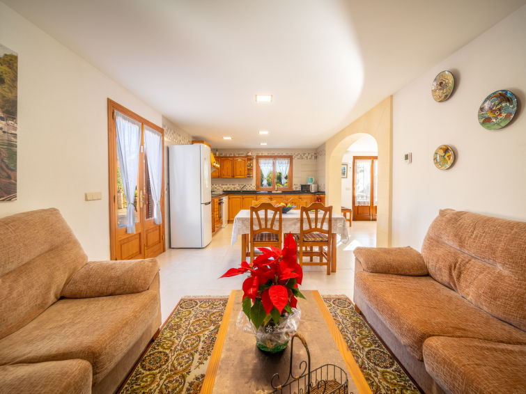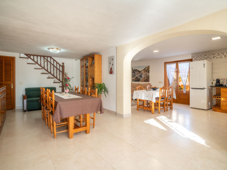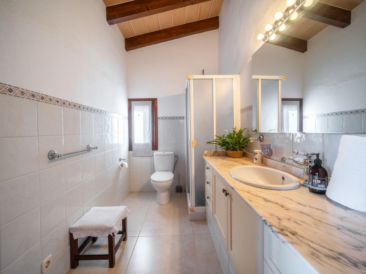 "Ca Na Guerrera", 6 rom villa 180 m2 på 2 etasjer. Rustikt og koseligt møbler: stue med, åpen peis, satelit-TV, flatskjerms TV, radio og DVD. Utgang til sitteplass i hagen, til badebassenget. 1 dobblet rom med 2 senger (90 cm lengde 190 cm), air-conditioning og varmluft oppvarming. 1 dobblet rom med, 1 dobbeltseng (150 cm, lengde 200 cm), air-conditioning og varmluft oppvarming. 1 rom med, 1 uttrekkbar seng, air-conditioning og varmluft oppvarming. Kjøkken (stekeovn, oppvaskmaskin, 4 keramiske kokeplater, mikrobølgeovn, frys, elektrisk kaffemaskin) med spisebord. Utgang til sitteplass i hagen, til badebassenget. Dusj/bidé/WC. øverste etasje: 1 stort dobblet rom med, 1 dobbeltseng (150 cm, lengde 200 cm), dusj/WC, air-conditioning og varmluft oppvarming. Utgang til balkongen. Naturstengulv. Behagelig møblering i landlig stil. Terrasse, sitteplass i hagen, plen. Terrassemøbler, balkongmøbler grill, liggestoler (8), overbygd balkong sitteplass. Utsikt av fjellene. Fasiliteter: vaskemaskin, safe, strykejern, høy barnestol barneseng for barn opp til 2 år, hårføner. Internett (trådløs LAN [WLAN], gratis). Ved hbrukt. Velegnet for familier. VTV415