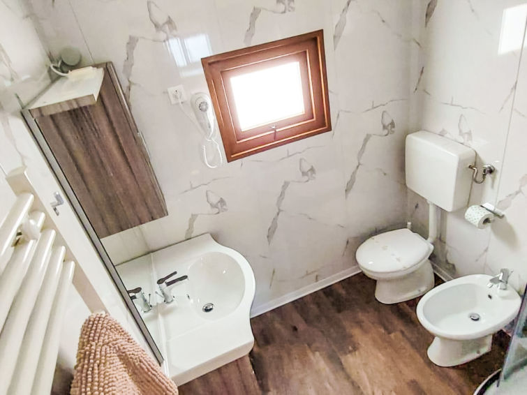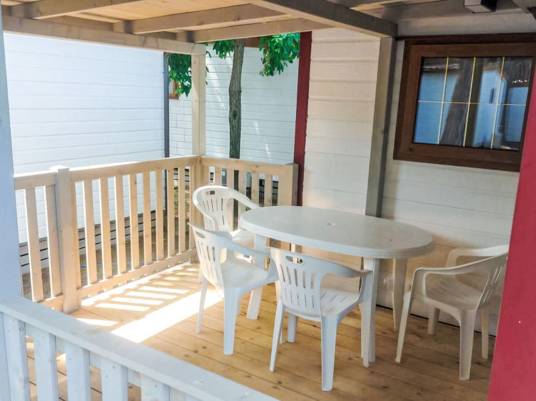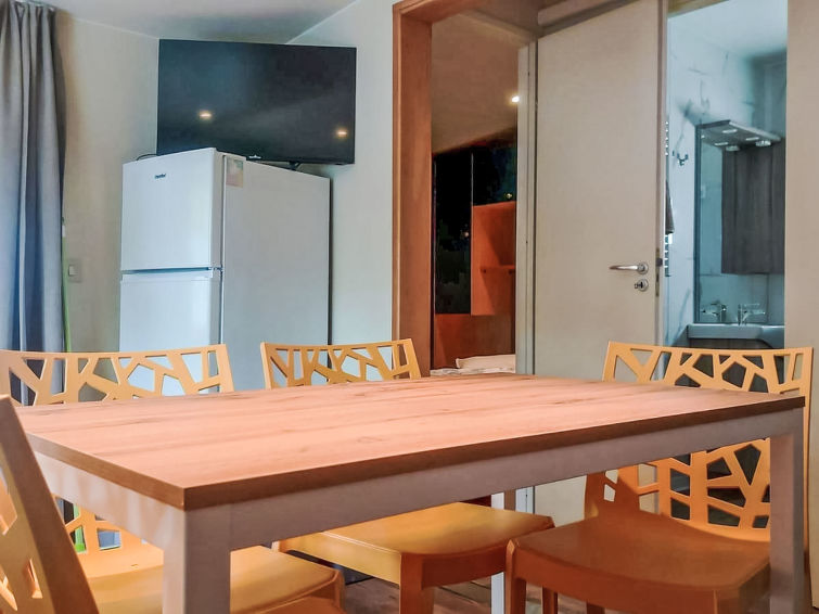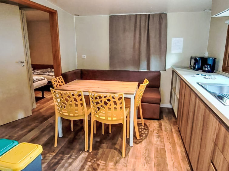 "Baia Lux", 3 rom campingvogn 31 m2. Praktiskt møbler: stue/spisestue med, spisebord og satelit-TV. 1 rom med, 1 dobbeltseng (140 cm). 1 rom med 2 senger (70 cm). Kjøkkenkrok (4 gassbrennere, frys). Dusj/bidé/WC. Airconditioning, varmluftsoppvarming. Sitteplass i hagen dekt. Fasiliteter: barneseng for barn opp til 2 år (ekstra). Parkeringsplass (1 Bil). Vennligst merk: røykfri bolig.