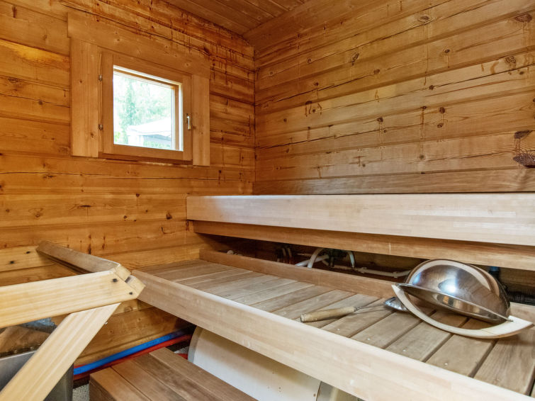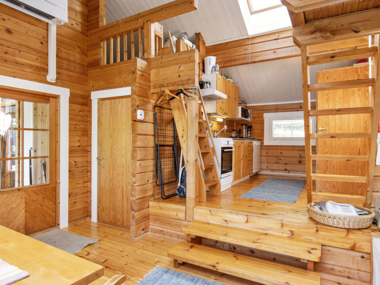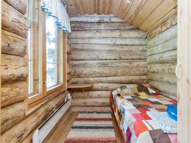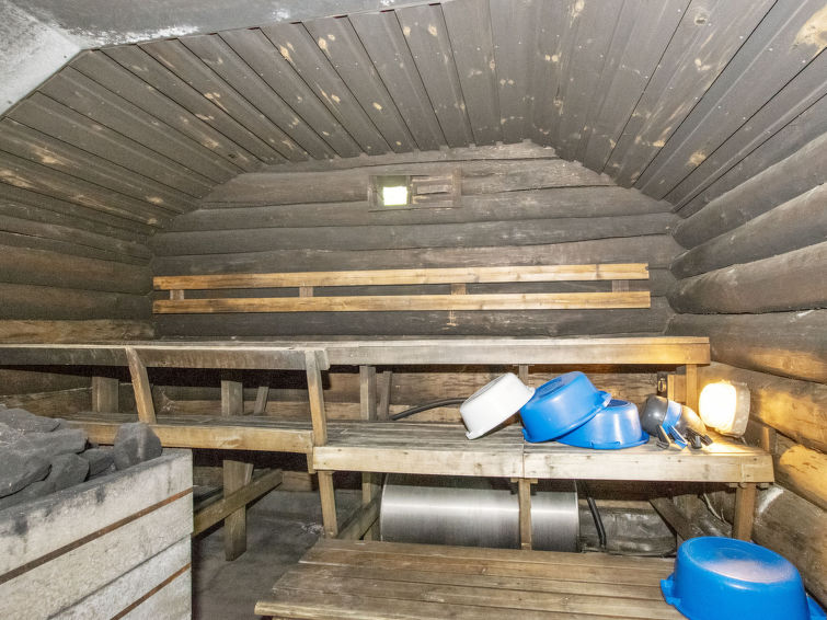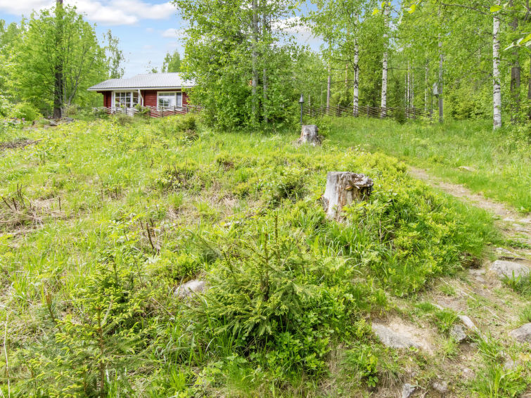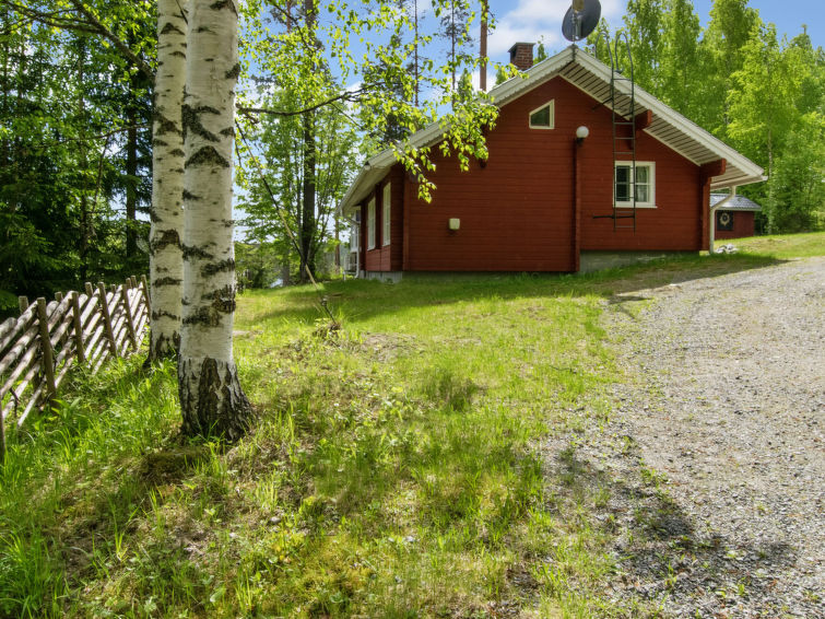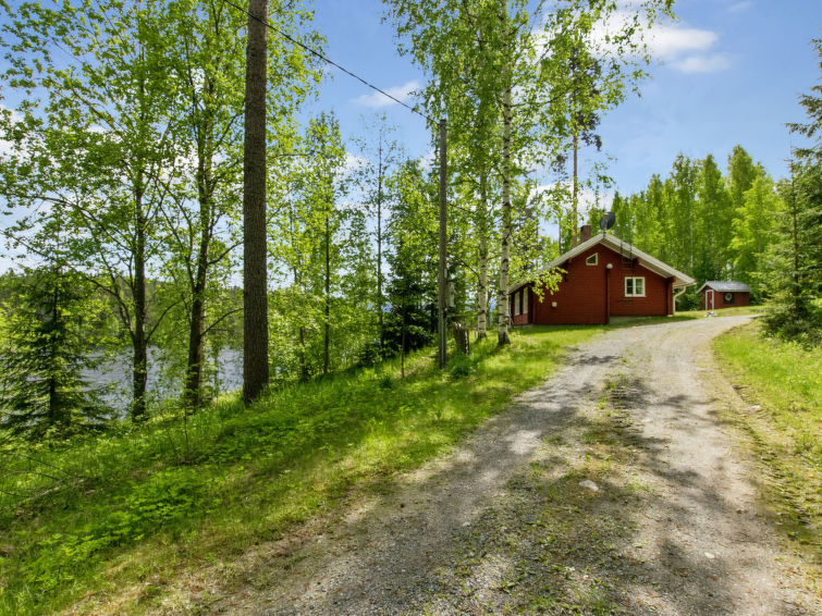 80 km southwest of Joensuu, Lake Pölläkkäjärvi 35 m (1,9 km²), shallow sanded mud and partly rocky bottom, own beach, rowing boat and jetty. Log cottage 1991, living room, kitchen, bedroom with double bed, sleeping gallery (9 m²) with 2 beds, sleeping gallery (4 m²) with 2 beds, bathroom, sauna (elec. stove), terrace. Own separate sauna building (10 m²) with wood heated stove (smoke sauna oven not in use), in sauna building a room with 2 beds, electricity and water supply.
