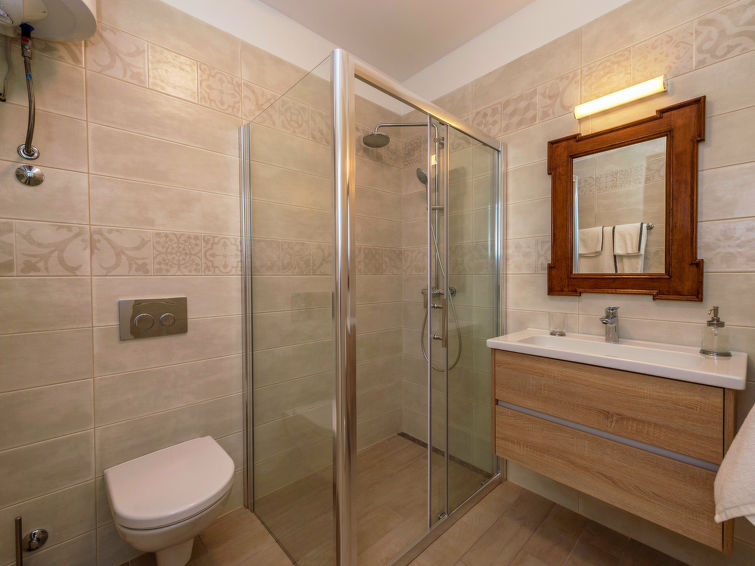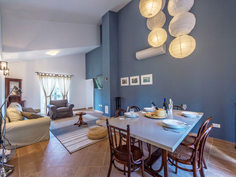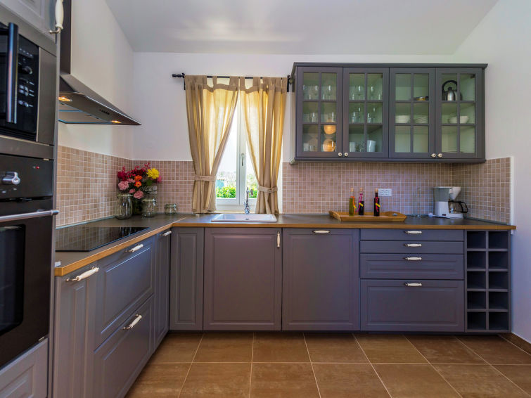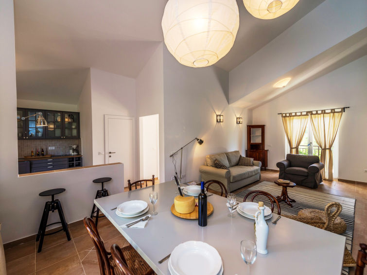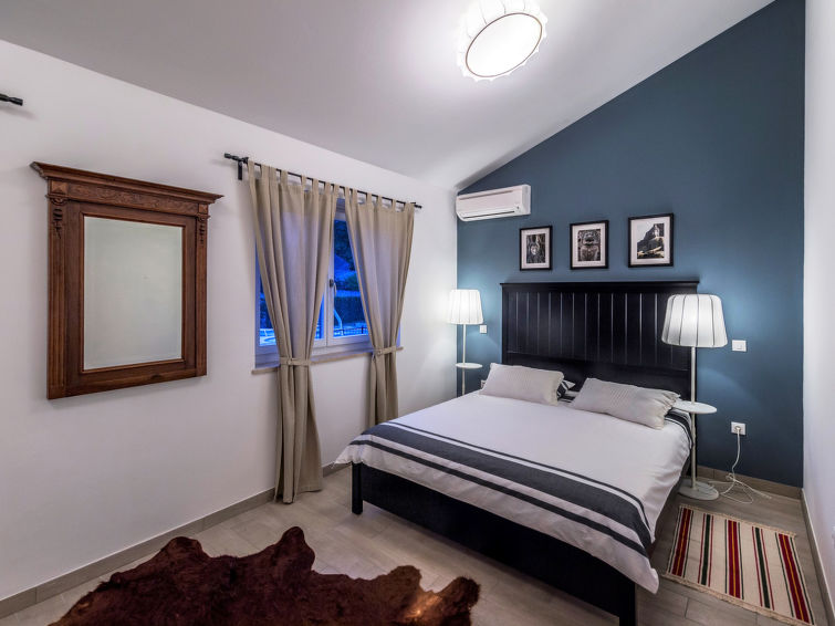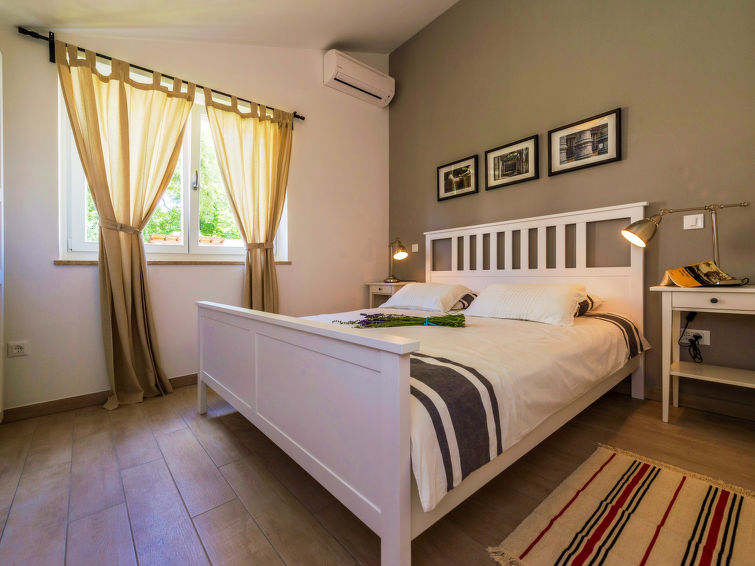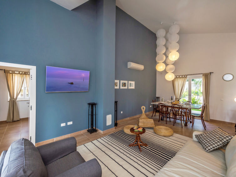 3 rom hus 120 m2. Vakkert møbler: stue/spisestue med, 1 dobbel sovesoffa (160 cm, lengde 200 cm), satelit-TV (flatskjerms TV), air-conditioning. Utgang til terrassen. 1 rom med, 1 dobbeltseng (160 cm, lengde 200 cm), air-conditioning. 1 rom med, 1 dobbeltseng (160 cm, lengde 200 cm), dusj/WC og air-conditioning. Åpent kjøkken (ovn, oppvaskmaskin, 4 keramiske kokeplater, frys, elektrisk kaffemaskin). Utgang til hagen. Dusj/WC, sep. WC. Varmluftsoppvarming. Terrasse 15 m2, dekt. Terrassemøbler, liggestoler. Utsikt av svømmebassenget og hagen. Fasiliteter: barneseng (ekstra). Internett (trådløs LAN [WLAN], gratis). 1 lite kjæledyr / liten hund tillatt.