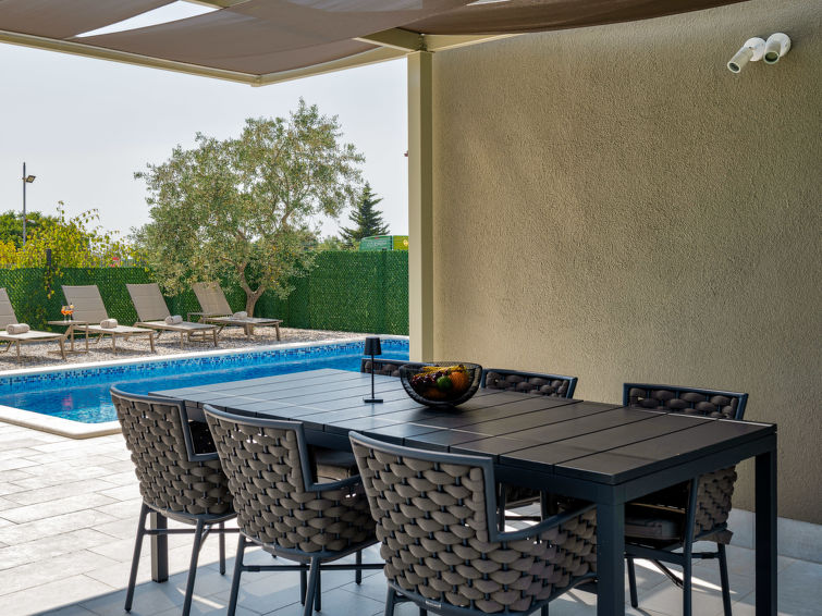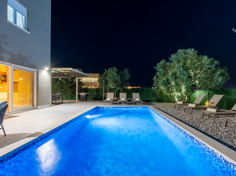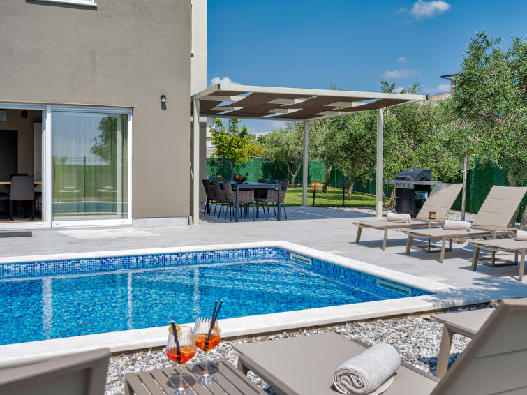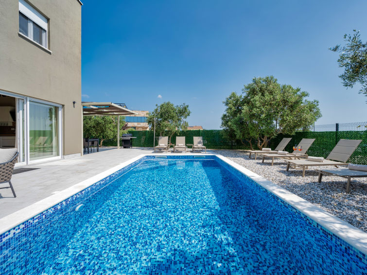 Vodnjan: Moderne, luksuriøs villa "Dolly Blue", med 2 etasjer. 700 m fra sentrum av Vodnjan, 6 km fra sentrum av Fažana, 10 km fra sentrum av Pula, 6 km fra sjøen, 6 km fra stranden. Privat: tomt 650 m2 (inngjerdet) med plen og blomster, svømmebasseng kantete (8 x 4 m, 32 m2, dybde 140 cm, Sesongåpent: 01.Mai. - 01.Okt.) med bassengrensningssystem med saltelektrolyse. Utendørs dusj, badminton, grill (huske). I huset: internetilkobbling, badstu, trikkpolinje, airconditioning, vaskemaskin. Parkering (for 3 biler) ved hbrukt på tomten. Butikk, supermarked 300 m, restaurant 1 km, småstenstrand 6 km, offentlig badeområde 6 km. Golfbane 7 km, tennis 2 km. Attraksjoner i nærheten: NP Brijuni 6 km, Amphitheater 10 km. Vennligst merk: velegnet for barnefamilier.