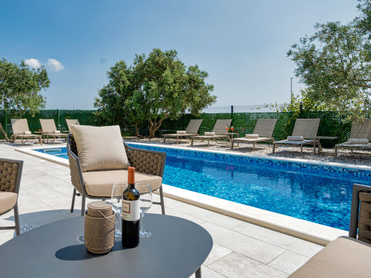 5 rom villa 185 m2 på 2 etasjer. Moderne og luksuriøst møbler: stue/spisestue med, satelit-TV (flatskjerms TV). Utgang til terrassen, til badebassenget. 1 rom med, 1 dobbeltseng (160 cm, lengde 200 cm), dusj/WC. Åpent kjøkken (stekeovn, oppvaskmaskin, 4 keramiske kokeplater, mikrobølgeovn, frys, elektrisk kaffemaskin). Dusj/WC. øverste etasje: 3 rom, hvert rom med, 1 dobbeltseng (160 cm, lengde 200 cm). Bad/WC, dusj/WC. Varmluftsoppvarming. Terrasse 20 m2. Terrassemøbler, liggestoler, lager. Utsikt av havet og svømmebassenget. Fasiliteter: høy barnestol barneseng, hårføner. Internett (trådløs LAN [WLAN], gratis). Vennligst merk: brannslukkningsapparat.
