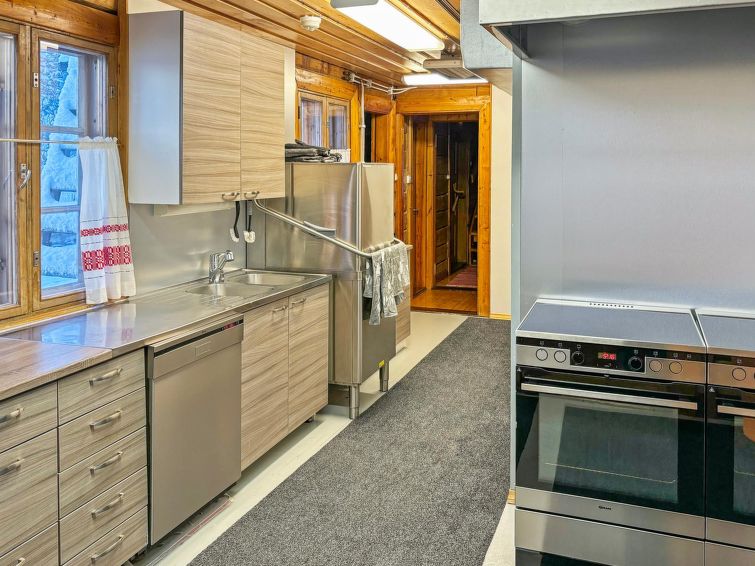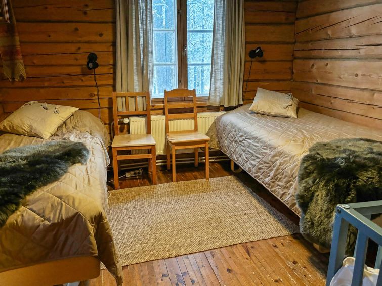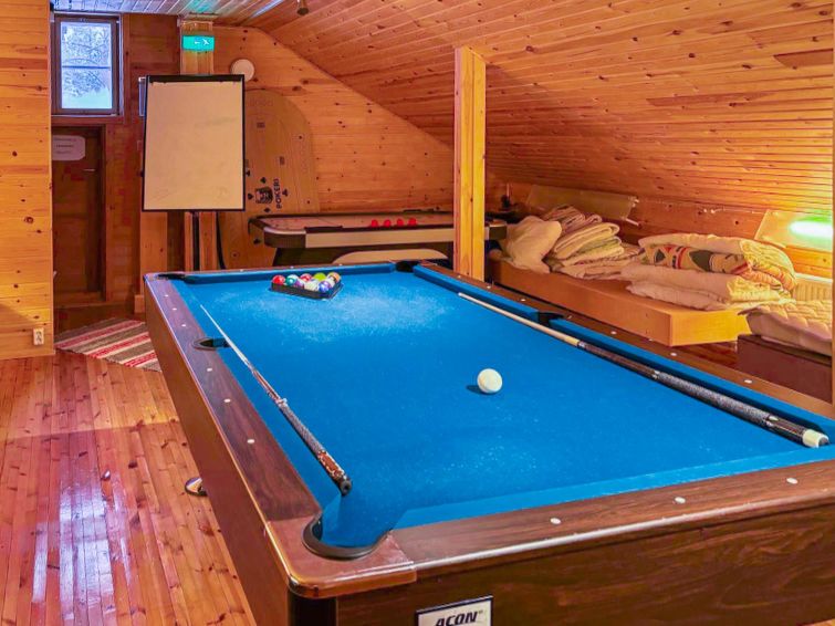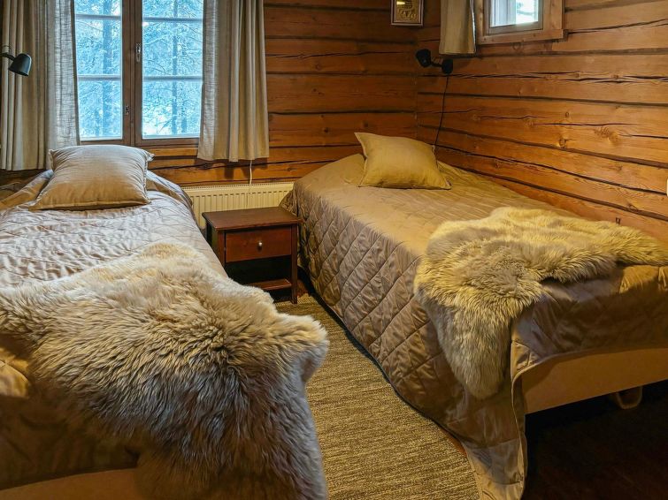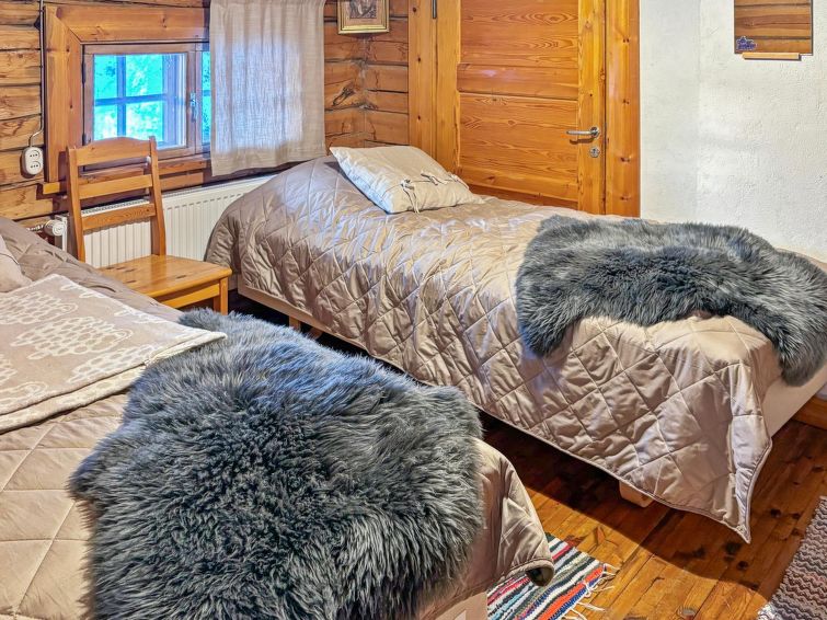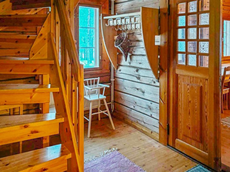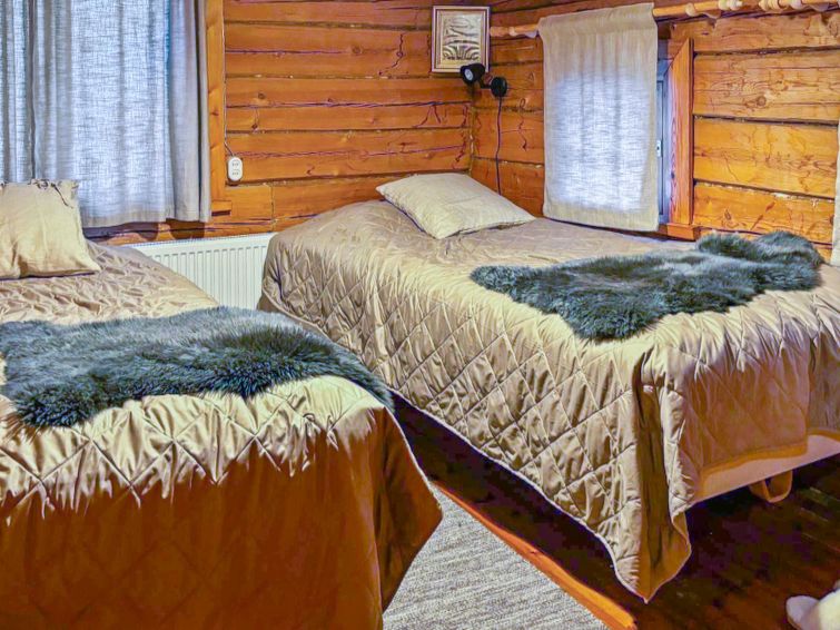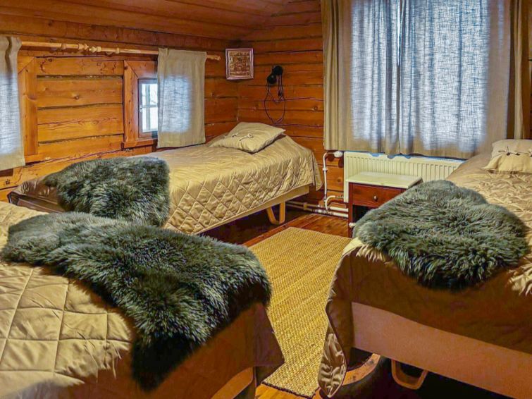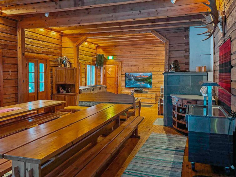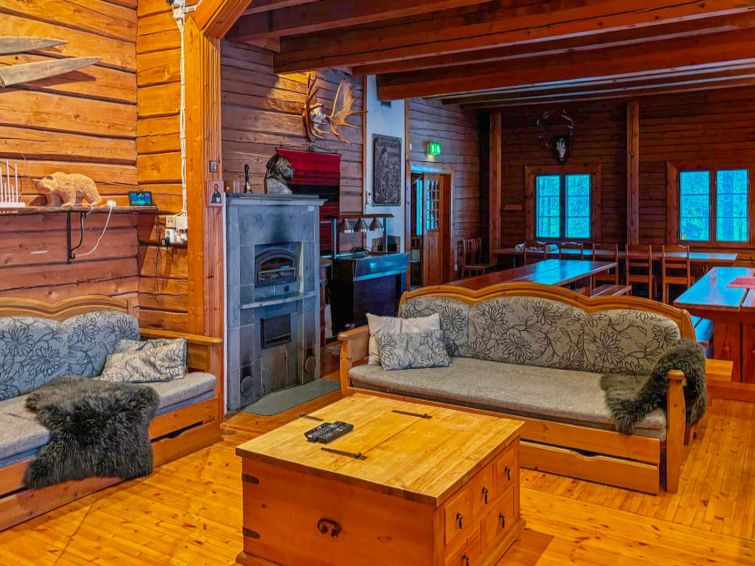 Large, hand-carved log cabin, built in 1964, renovated and modernized in 2015, spacious living room, kitchen, 5 bedrooms (all bedrooms with 2 beds in each), sauna (electric sauna stove), washroom with hydro massage bath and 2 showers, dressing room and living-, exhibition- and meeting area. Three of the bedrooms are upstairs, sauna facilities downstairs.