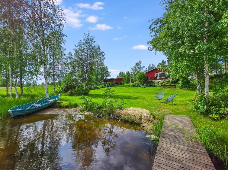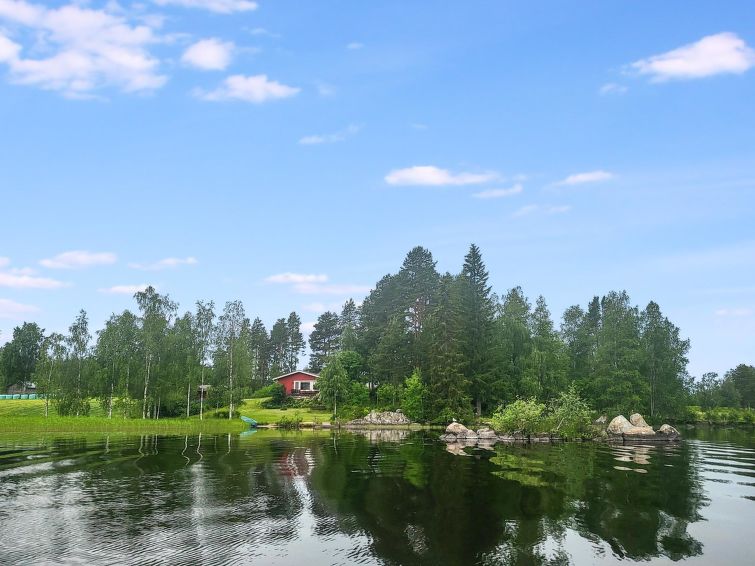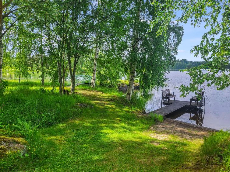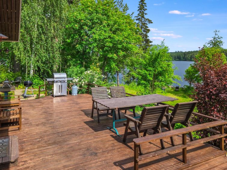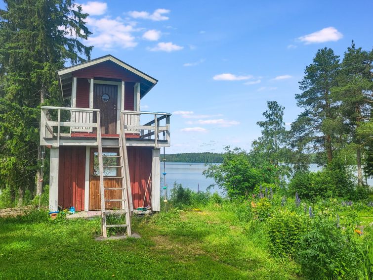 A wooden terrace 30 m² between the cottage and beach, barbecue and large dining area, beautiful view to the lake. For children, a two-storey playhouse on a hill near the yard. Detached house on promontory, maintained yard area. Peaceful landscape.
