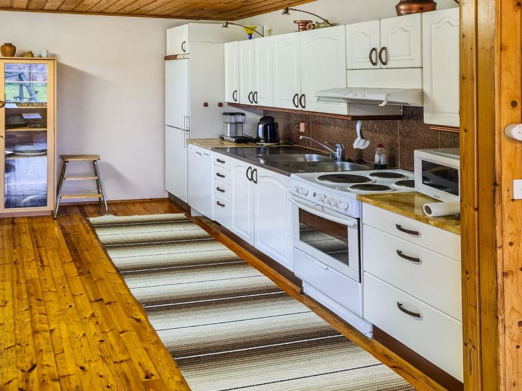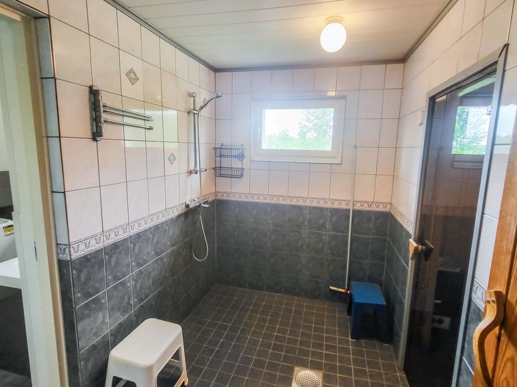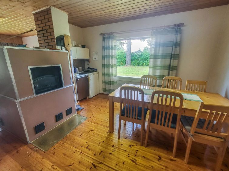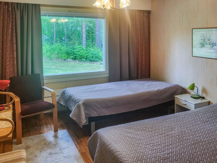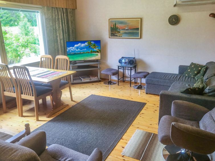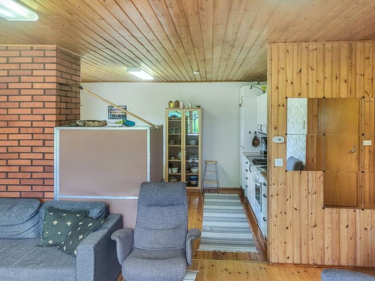 Wooden detached house 1980, renovated 2006 and 2015, kitchen, living room with convertible sofa, bedroom double bed (160 cm wide), bedroom 2 double beds (other 160 cm and other 120 cm wide), additional room with sofa bed (appr. 120 cm wide), washing room, dressing room, sauna (electric stove), utility room (washer, drying cabinet) where also another toilet, hall, glazed porch.