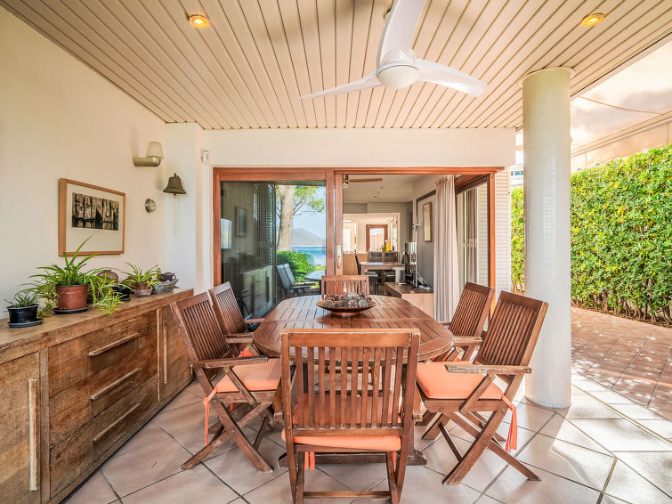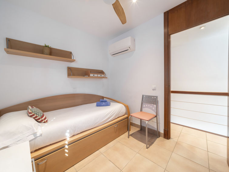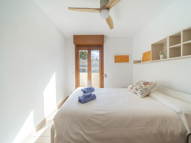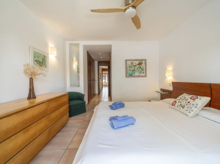 "Es Clot", 5 rom halvpart av tomannsbolig 125 m2 på 2 etasjer. Passer for 8 voksne. Romlig og lys, meget komfortabelt og smakfullt møbler: stor stue/spisestue med etasjer panoramavindu med, spisebord, satelit-TV, air-conditioning og varmluft oppvarming. Utgang til sitteplass i hagen. Kjøkken (stekeovn, oppvaskmaskin, 3 keramiske kokeplater, brødrister, vannkoker, mikrobølgeovn, frys, elektrisk kaffemaskin) med spisebord. Bad/WC. øverste etasje: 1 stort dobblet rom med etasjer panoramavindu med, 1 dobbeltseng, bad/dusj/WC, air-conditioning og varmluft oppvarming. Utgang til balkongen. 1 dobblet rom med panoramavindu med, 1 x 2 køysenger (90 cm), air-conditioning og varmluft oppvarming. 2 rom med panoramavindu, hvert rom med, 1 uttrekkbar seng (2 pers. 2 x 90 cm), air-conditioning og varmluft oppvarming. Bad/WC med hjørnebadekar. Sitteplass i hagen, plen. Terrassemøbler, grill, liggestoler, overbygd balkong. Hærlig utsikt av havet og fjellene. Fasiliteter: vaskemaskin, strykejern, høy barnestol barneseng, hårføner. Internett (trådløs LAN [WLAN], gratis). Parkeringsplass (inngjerdet), garasje. Velegnet for familier. L95E21742
