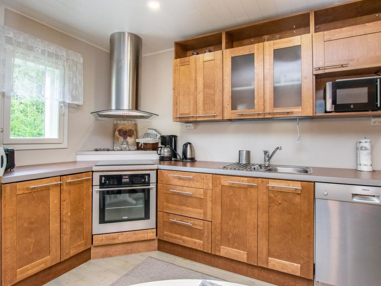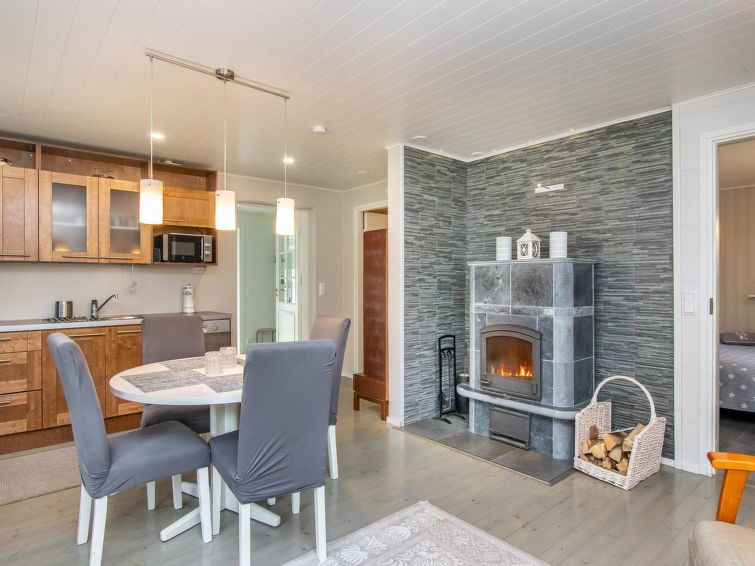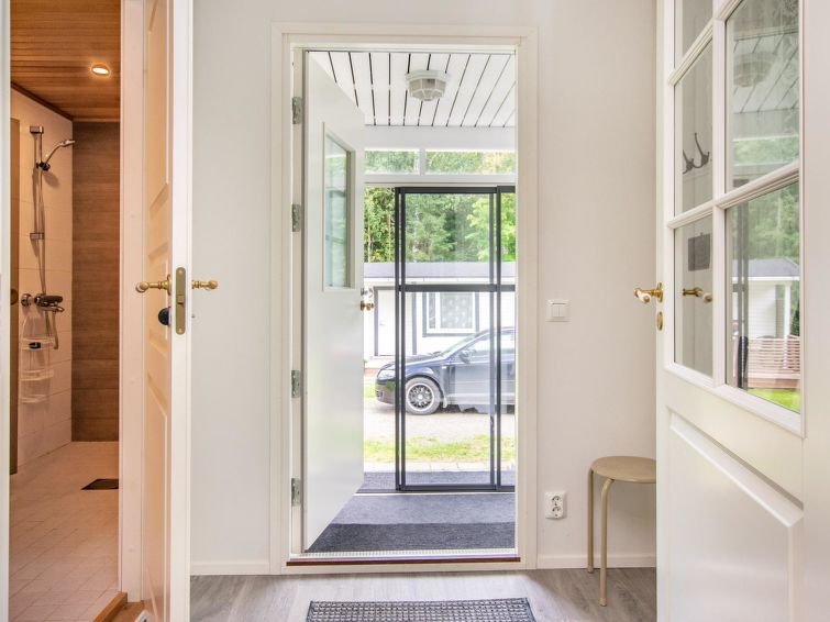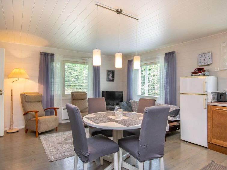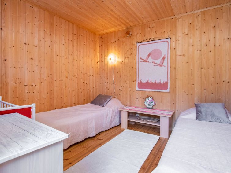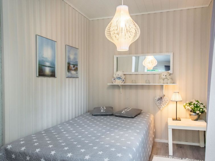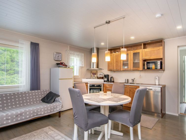 Wooden cottage 1958, renovated 2019, kitchen/living room convertible sofa bed, bedroom with 120 cm wide bed, bedroom with double bed (width 160 cm), hall, porch. Sauna (electric stove), bathroom with shower, WC and dressing room.