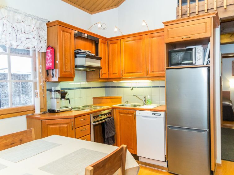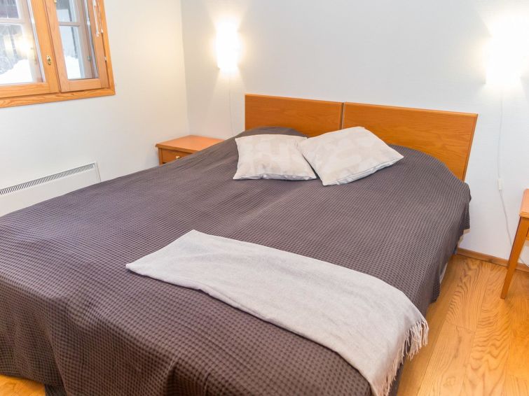 In this semi-detached apartment you have downstairs a living room/kitchen, a bedroom with 2 beds, a washroom, a separate toilet, sauna (electric stove), a hall and a terrace. The loft has a bedroom with 2 beds and 2 extra beds in the lobby lof the loft. Distance to the ski slopes approx. 0.8 km, to the spa 0.5 km. 0.4 km to Lake Syväri, 1.5 km to the common shore, no own boat, 13 km to Nilsiä, 65 km to Kuopio. Tahko Golf 0.1km, IKEA and Matkus shopping center 70km. Tahko Old Course 0.1km.