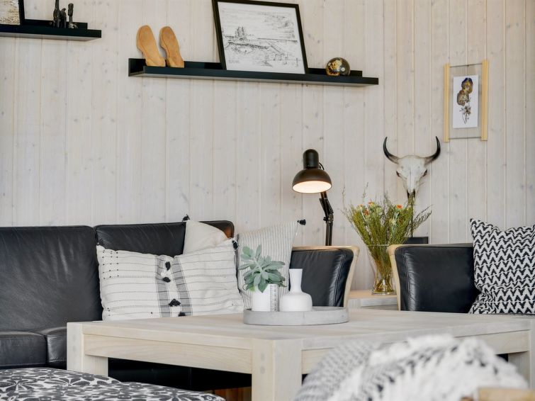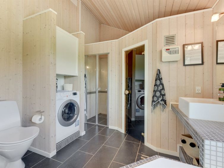 Enmannsbolig, bygget i 2007. 100 m fra sjøen. Privat: tomt 824 m2, velholdt hage. Terrasse (50 m2), lekeplass (huske). I huset: badstu, vaskemaskin, tørketrommel. Parkering ved hbrukt. Daglivarehandel 4 km. Golfbane 8 km. Eieren godtar ikke noen ungdomsgrupper.