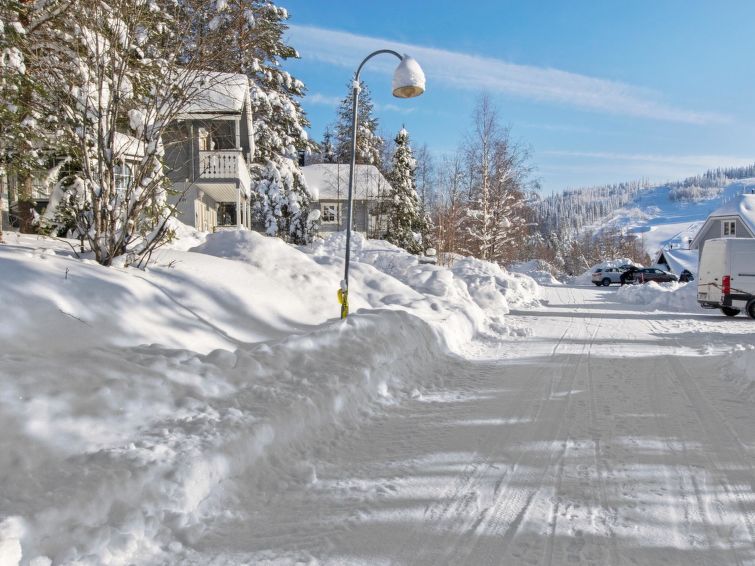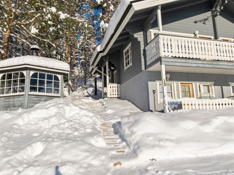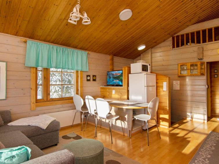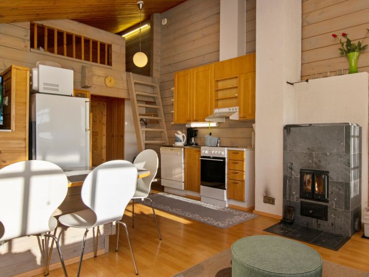 A semi-detached house located in the Ukkohalla tourism centre, 52m2 + loft 8m2, built in 1989, renovated in 2004. Kitchen, bedroom with two beds, loft, sauna, shower room/toilet, separate toilet, dressing room, storage, balcony, terrace, fireplace and firewood, two mattresses on the loft, living room sofa-bed.