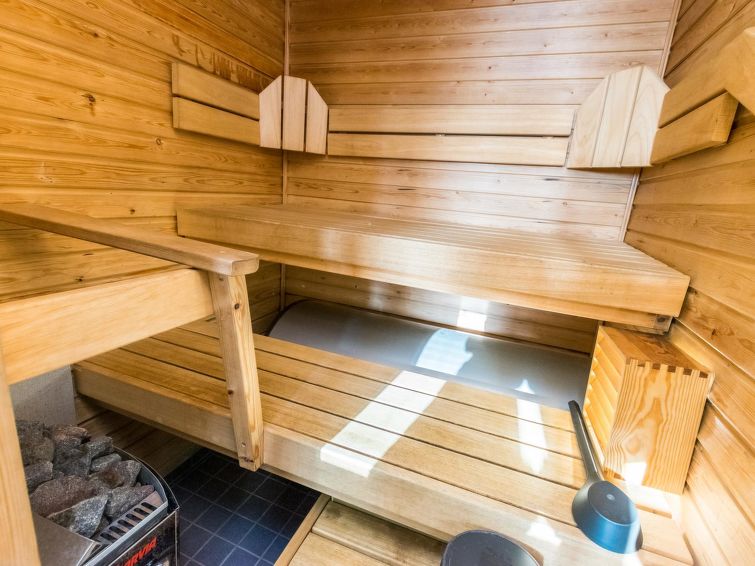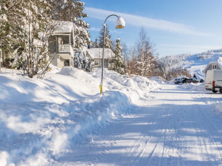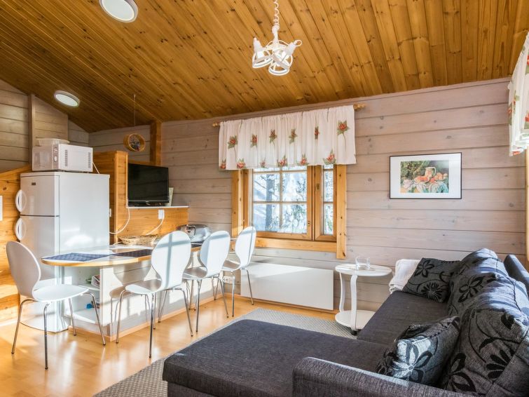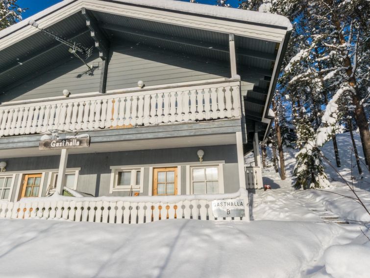 A semi-detached house located in the Ukkohalla tourism centre, 52m2 + loft 8m2, built in 1989, renovated in 2004. Kitchen, bedroom, loft, sauna, shower room/toilet, separate toilet, dressing room, storage, balcony, terrace, fireplace and firewood. 2 beds in the bedroom, 2 mattresses on the loft, a sofa-bed in the living room.