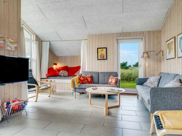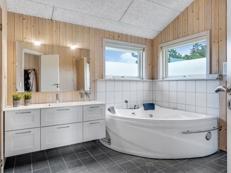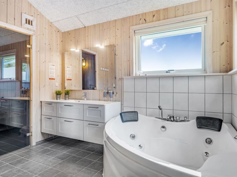 "Griselda" - 700m from the sea in NW Jutland", 4 rom hus 100 m2. Passer for 6 voksne. Stue med, TV. 1 rom med, 1 dobbeltseng. 1 rom med, 1 dobbeltseng. 1 rom med 2 senger. Kjøkken (stekeovn, oppvaskmaskin, 4 induksjonskomfyr, mikrobølgeovn, frys). 2 dusjer/WC, boblebad. Terrasse 16 m2, dekt. Fasiliteter: Internett (trådløs LAN [WLAN]). Vennligst merk: røykfri bolig. Max kjæledyr / hund tillatt 1 kjæledyr / hund tillatt.
