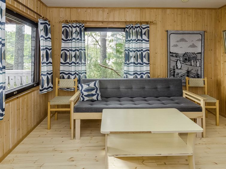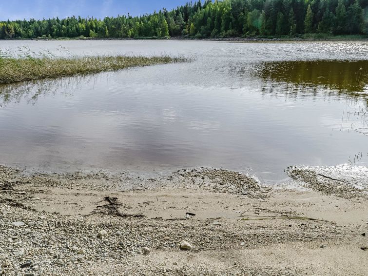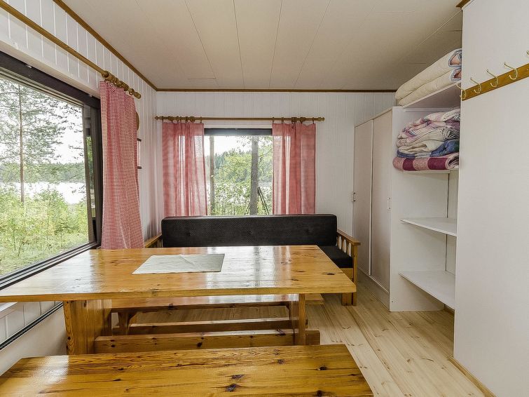 11 km to the south from Nurmes, lake Pielinen 20 m (871,2 km², length 100 km, width 20 km), gently deepening hard bottom, pier, own boat. Wooden cabin, built in 1990, renovated in 2002 and 2019. Living room with wooden sofa bed, kitchen with wooden sofa bed, bedroom with 2 beds, wood heated sauna, washroom, open porch.
