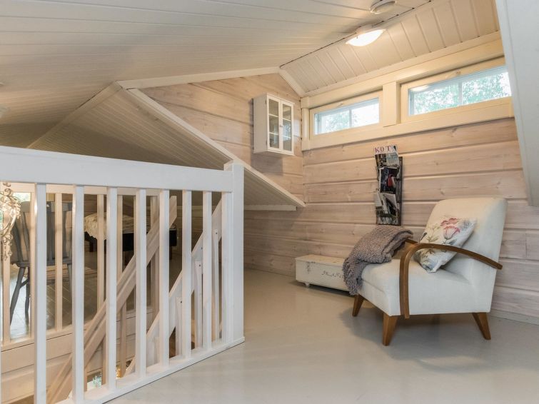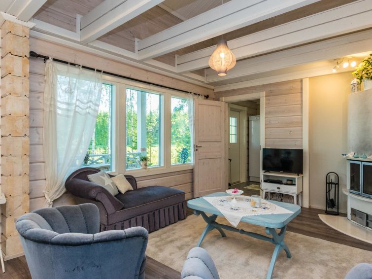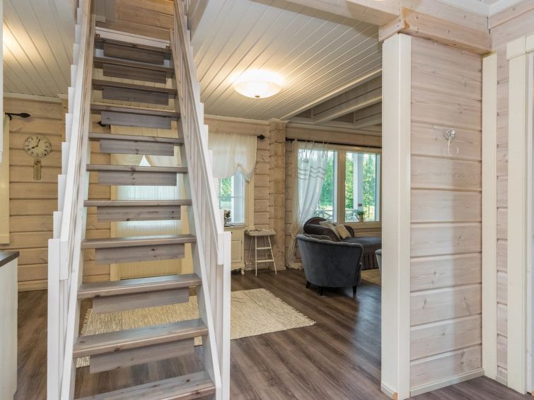 Log cabin 2014, kitchen, living room, bedroom (10 m²) with double bed, another bedroom (10 m²) with two beds, dressing room, washroom, sauna (electric sauna stove), separate WC, covered porch and large terrace.