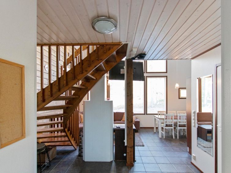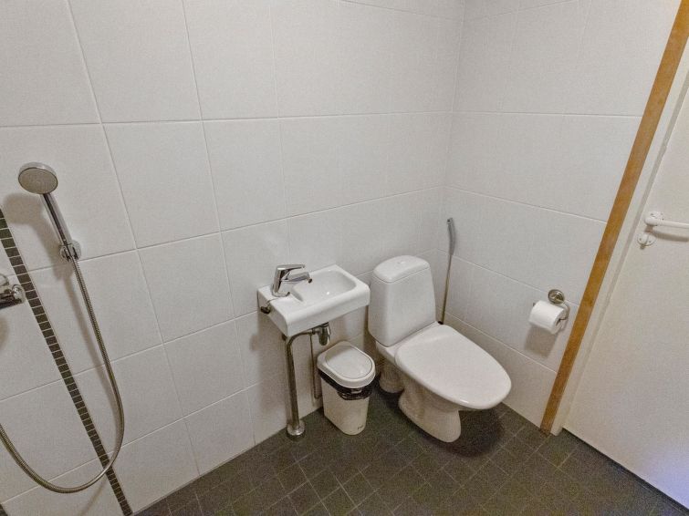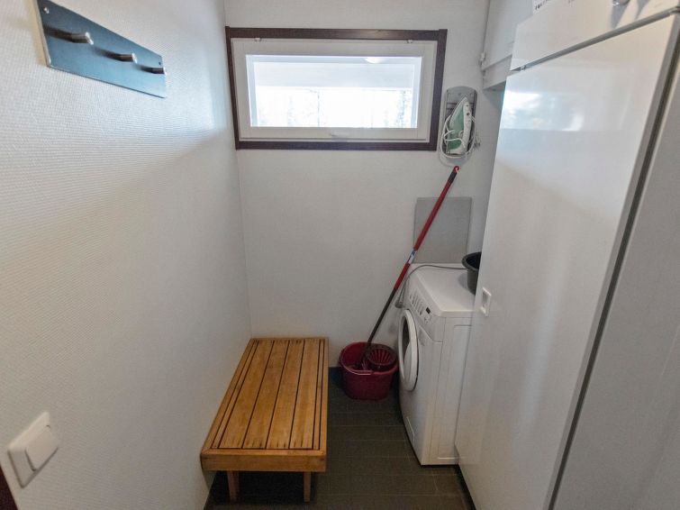 Downstairs: livingroom/kitchen, bedroom with two beds, utility room, washing room, electric sauna, two toilets and heated storage/maintenance room.
