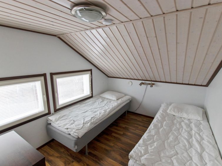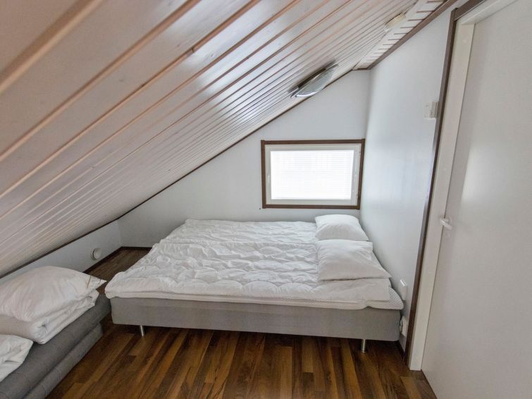 Upstairs: bedroom with two beds and open loft space with 140 cm wide bed and 2 extra mattresses. Child safety gate both upstairs and downstairs.