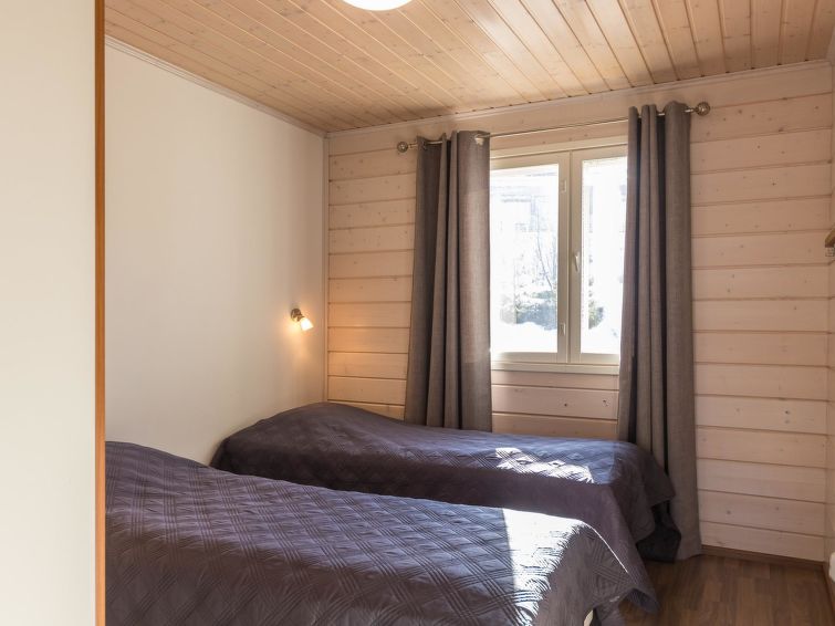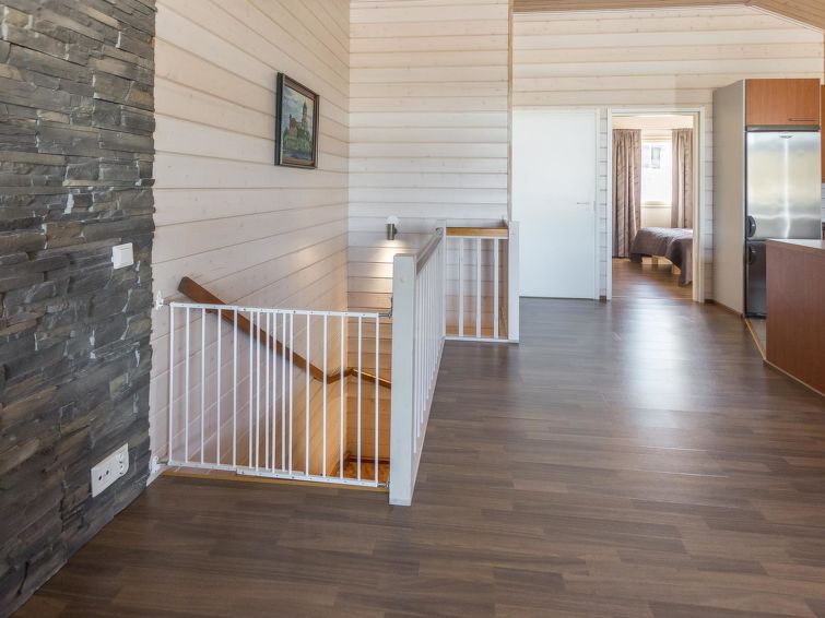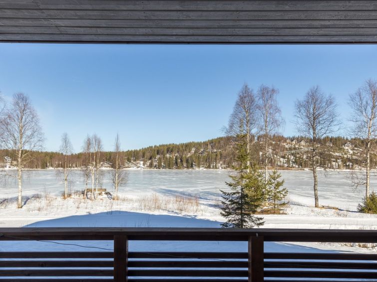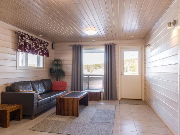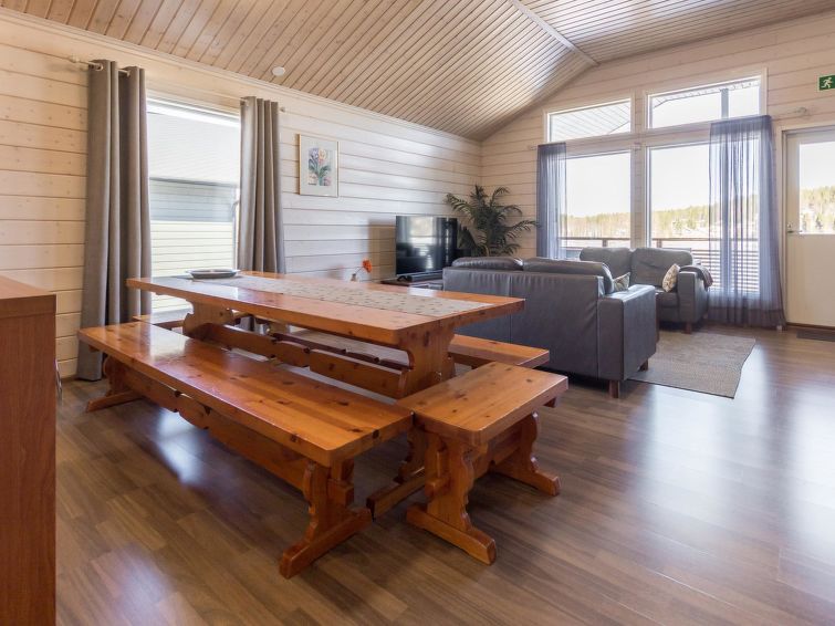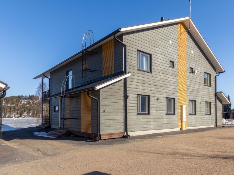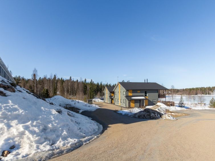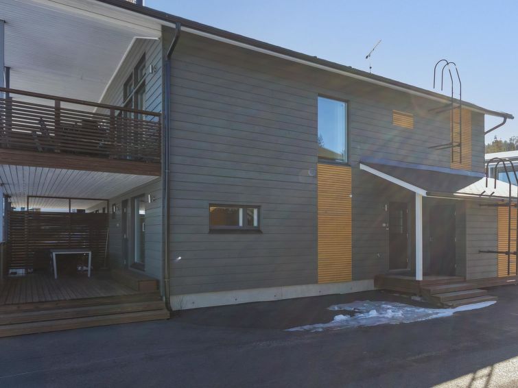 A semi-detached house located in the Ukkohalla tourism centre, 125 m2, for 10-14 persons, built in 2009.Premises on 2 floors; on the first floor 2 bedrooms, livingroom, sauna, shower room/toilet, terrace. On the second floor kitchen, 1 bedroom, shower room/toilet, terrace. Storage, fireplace. View to the lake Syväjärvi. In 2 bedrooms 2 beds/room, double bed in one bedroom, sofa-bed and 2 extra beds in the livingroom and in the kitchen. Price includes 1 bag of firewood. Extra wood from caretaker 10 euroa/bag. Ukkohalla: Tourism centre located by Lake Syväjärvi, with an information centre, store, restaurant, spa, slope centre, snowmobile tracks, ski tracks, programme services, beach (further information at www.ukkohalla.fi). Distance to the Ukkohalla services 0.1 km. Kajaani airport 86 km, Oulu 170 km, Helsinki 650 km, bus stop Hyrynsalmi 18 km, railway station Kontiomäki 66 km. Pets not allowed, view to the Lake Syväjärvi. Final cleaning is including. ADDITIONAL FEE FOR LINEN 13€/PERSON. LINEN ARE FORCED.