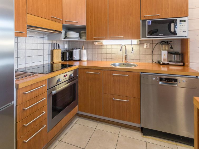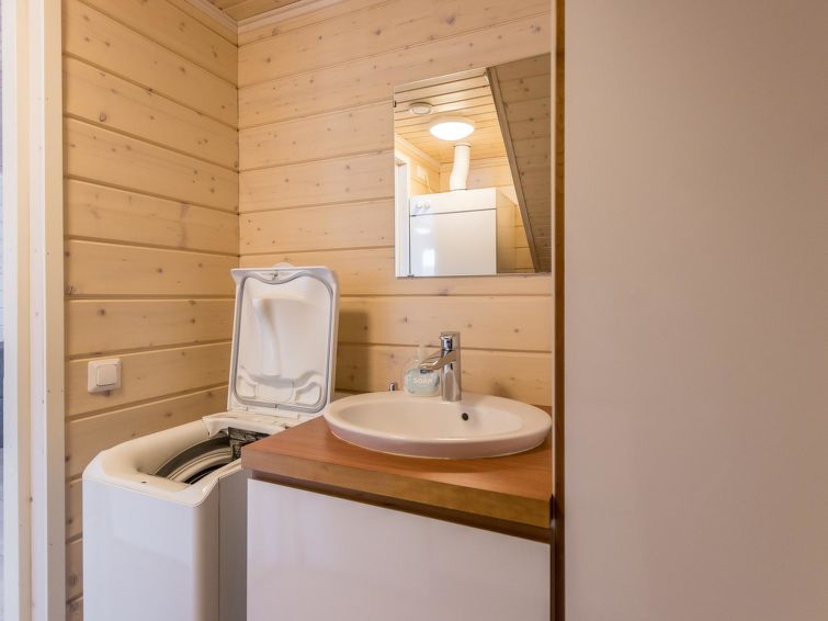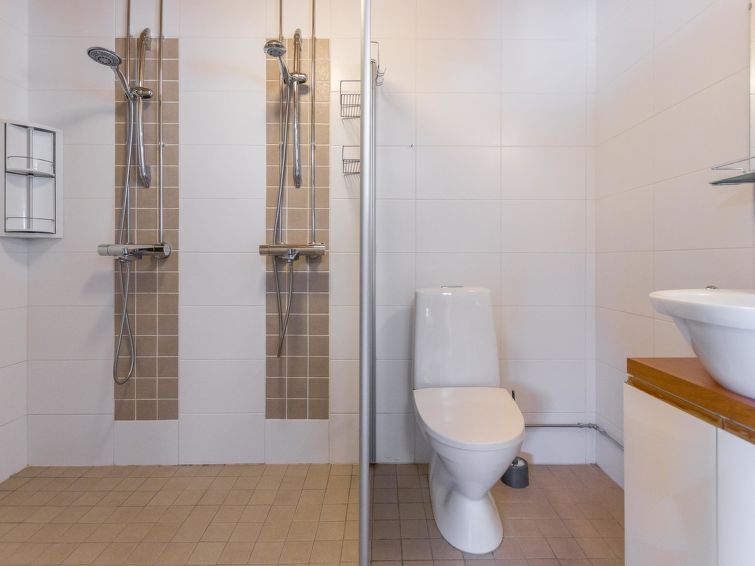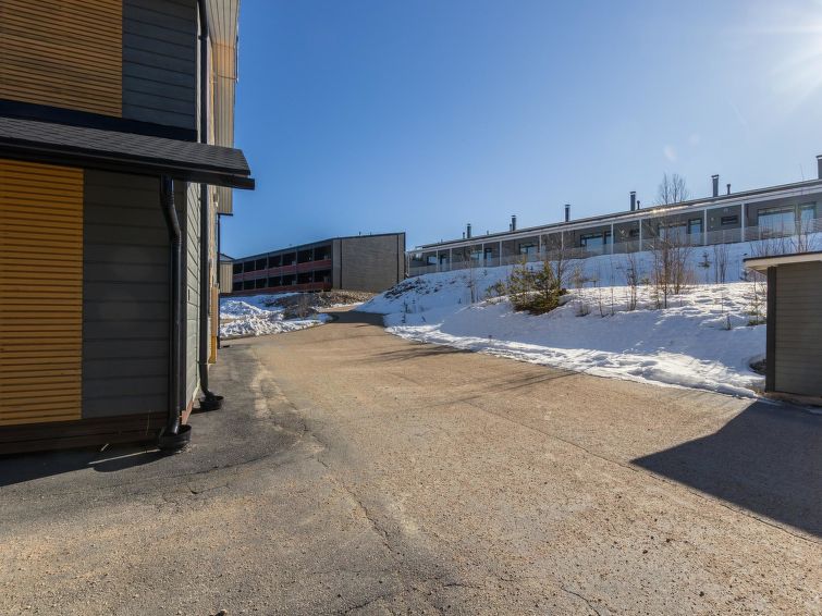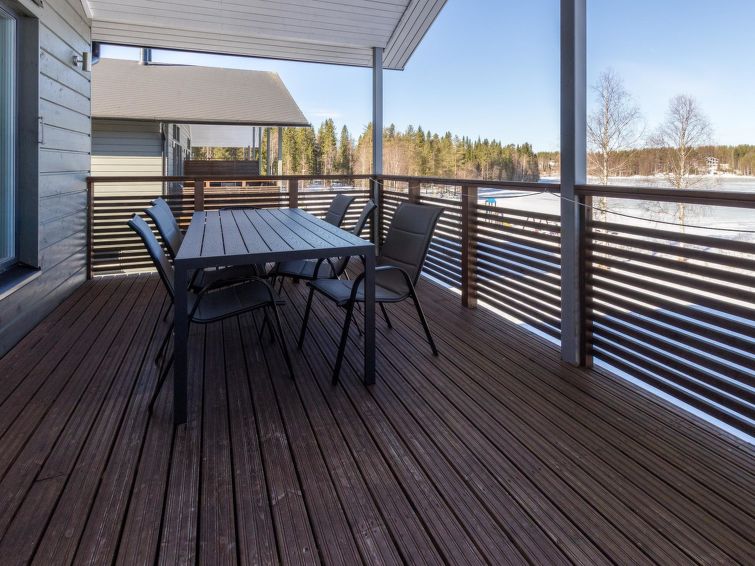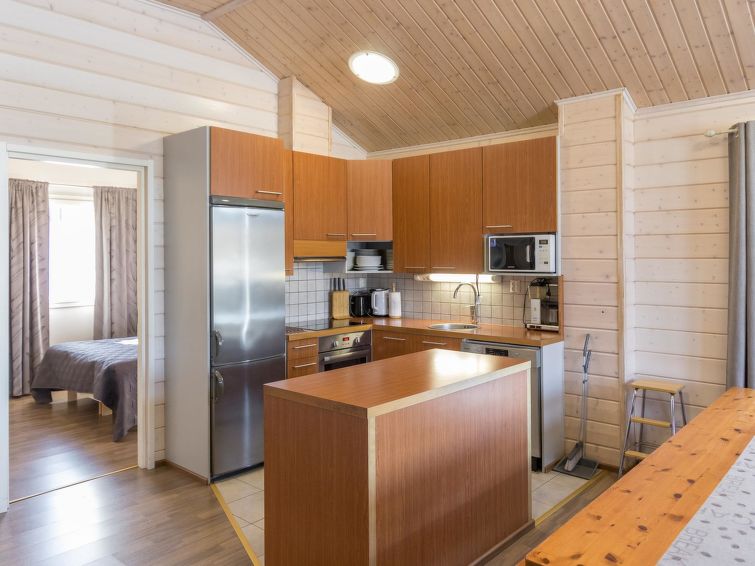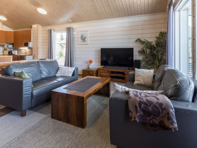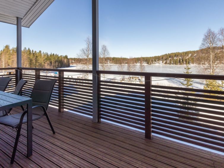 A semi-detached house located in the Ukkohalla tourism centre, 125 m2, for 10-14 persons, built in 2009.Premises on 2 floors; on the first floor 2 bedrooms, livingroom, sauna, shower room/toilet, terrace. On the second floor kitchen, 1 bedroom, shower room/toilet, terrace. Storage, fireplace. View to the lake Syväjärvi. In 2 bedrooms 2 beds/room, double bed in one bedroom, sofa-bed and 2 extra beds in the livingroom and in the kitchen. Price includes 1 bag of firewood. Extra wood from caretaker 10 euroa/bag. Ukkohalla: Tourism centre located by Lake Syväjärvi, with an information centre, store, restaurant, spa, slope centre, snowmobile tracks, ski tracks, programme services, beach (further information at www.ukkohalla.fi). Distance to the Ukkohalla services 0.1 km. Kajaani airport 86 km, Oulu 170 km, Helsinki 650 km, bus stop Hyrynsalmi 18 km, railway station Kontiomäki 66 km. Pets not allowed, view to the Lake Syväjärvi. Final cleaning is including. ADDITIONAL FEE FOR LINEN 13€/PERSON. LINEN ARE FORCED.