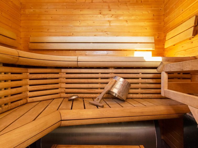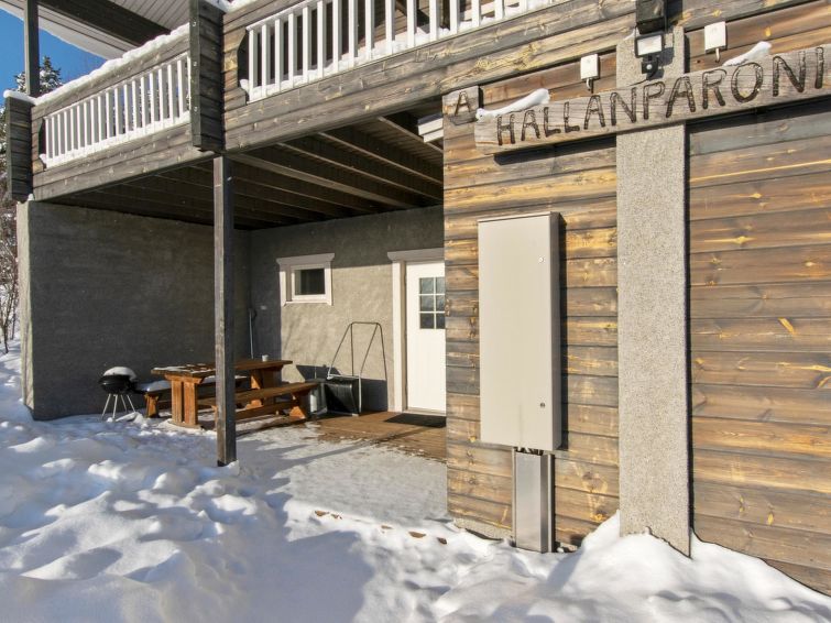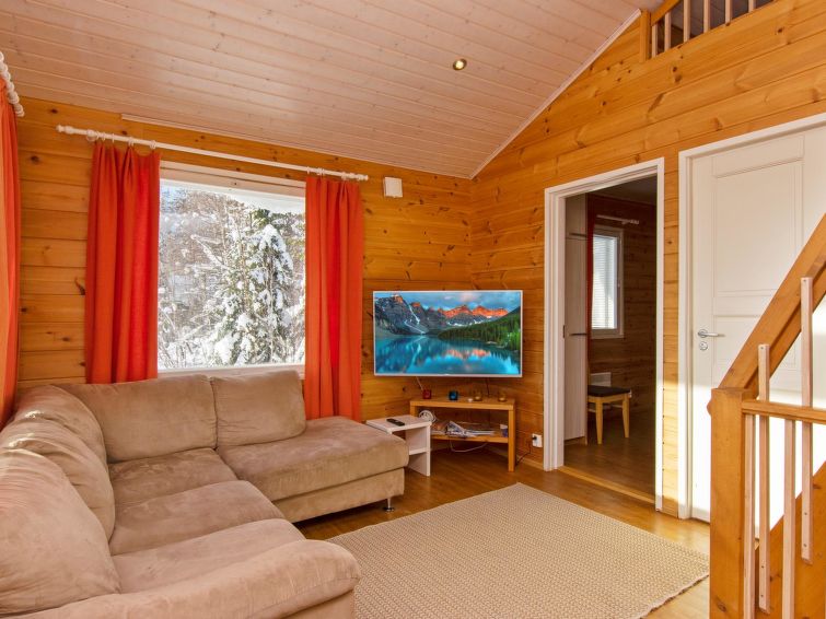 An apartment in a semi-detached house located in the Ukkohalla tourism centre, 68 m² + loft 23 m², built in 2007, premises on 3 floors (steep stairs), kitchen, 2 bedrooms, loft, sauna, shower room/toilet, separate toilet, room with a fireplace including a sofa-bed, storage, balcony, terrace, fireplace and firewood. 2 beds in the bedroom, a 120 cm double bed in the other bedroom, 4 mattresses on the loft. Price includes firewood.