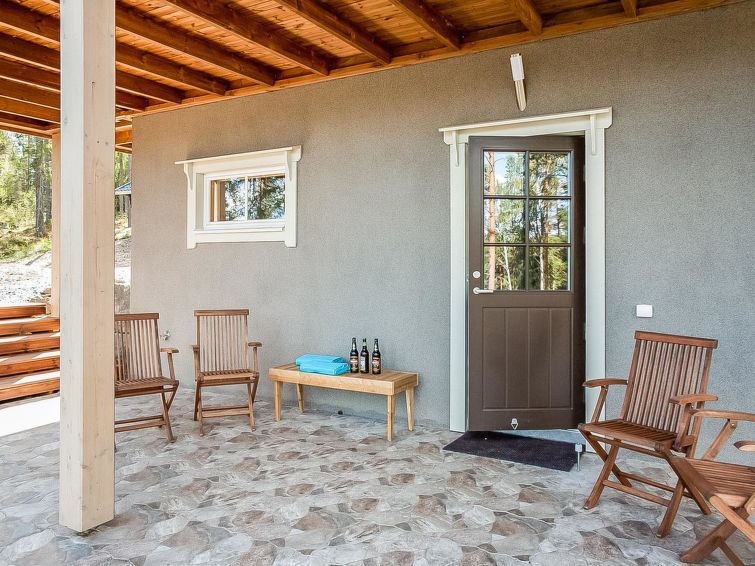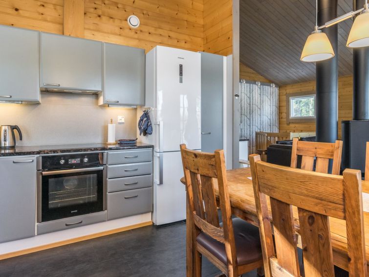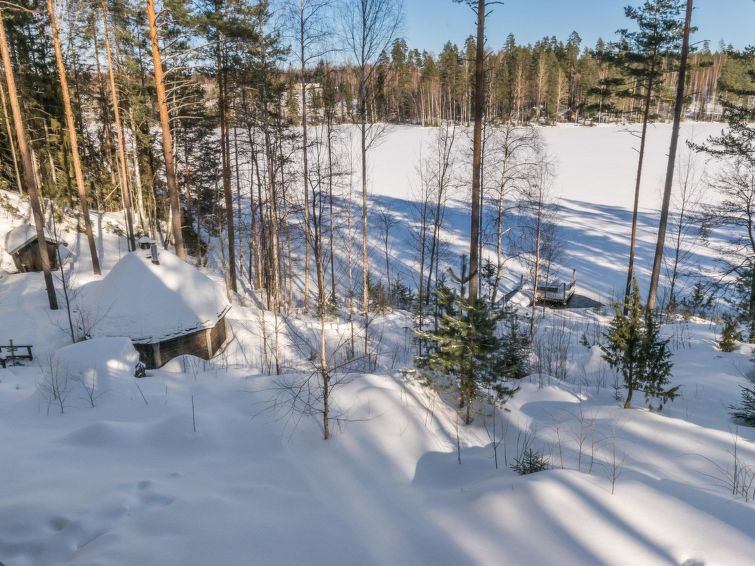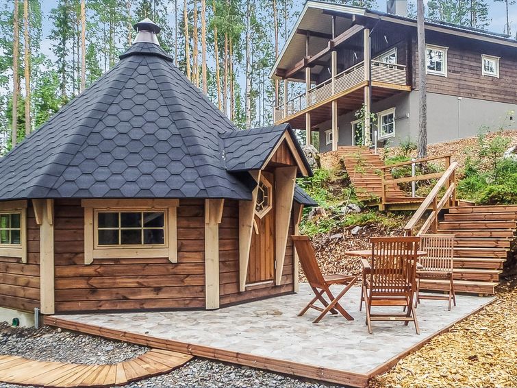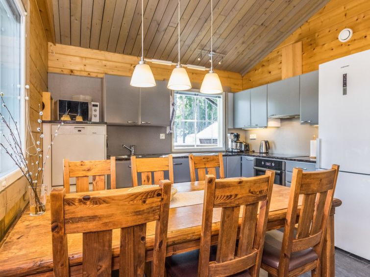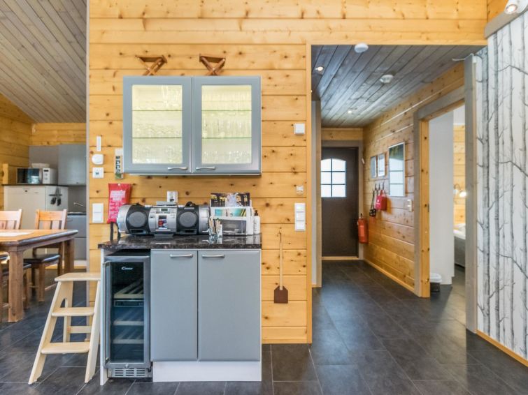 The rental villa Hapero is located on a wonderful hillside plot on the shore of the lake Kaitajärvi. On the sturdy pier, you can relax and enjoy the beautiful landscape while sitting on a bench. Inside the villa, a modern living room/kitchen awaits you, which is equipped with all the necessary equipment. The kitchen also has a wine cabinet where you can keep your drinks cool. The living room has a comfortable sofa and an entertainment system that includes a smart TV and home theater, so you can relax and watch movies with friends or family, there's enough work even for rainy days.