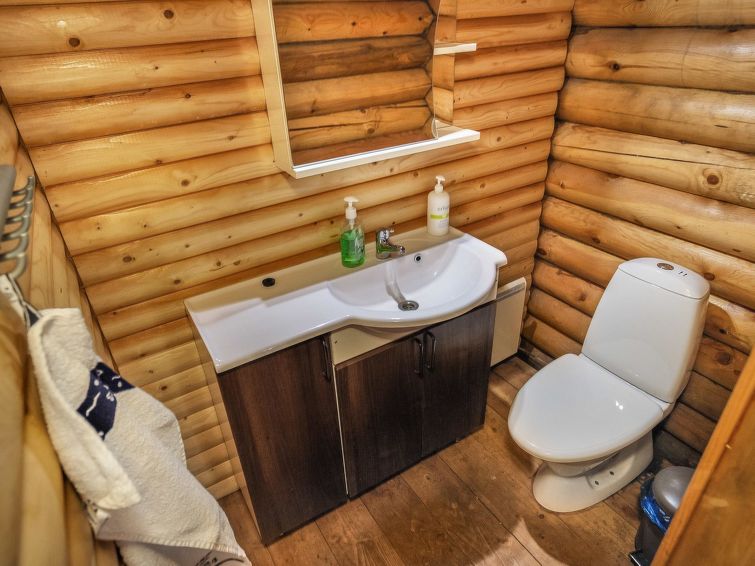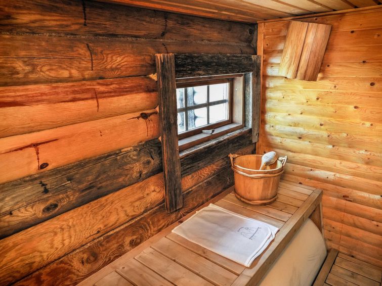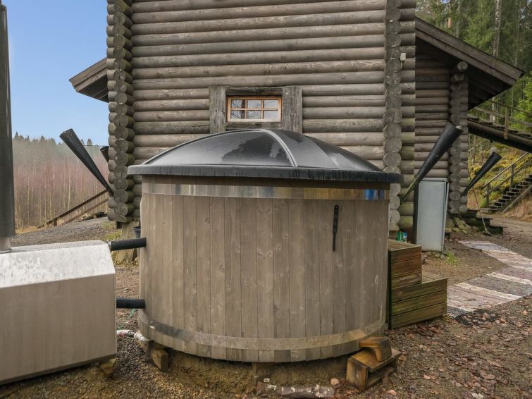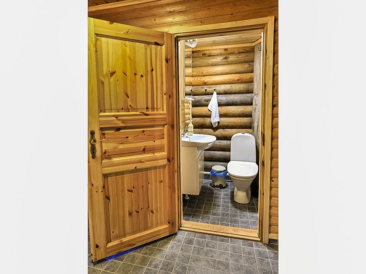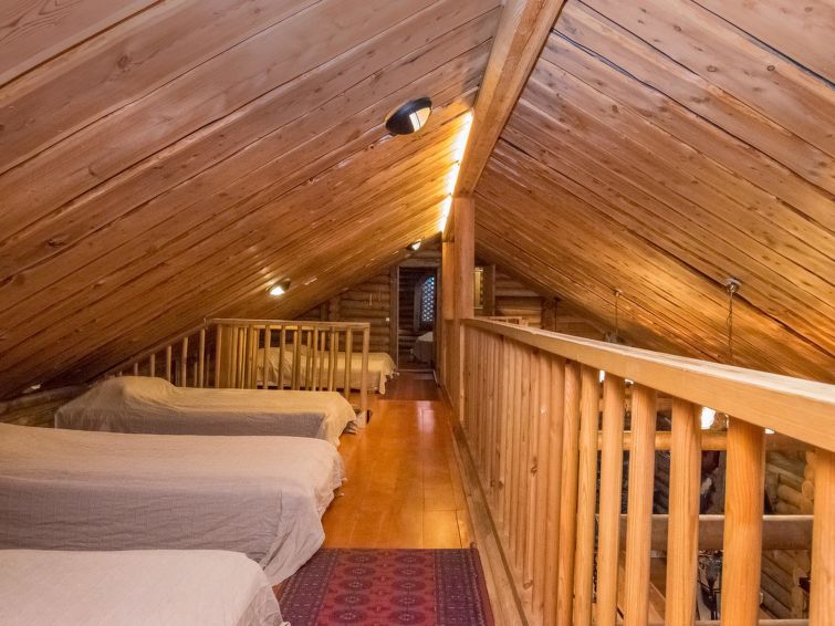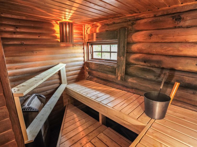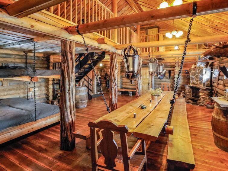 Log cabin 2006, living room/kitchen 8 extra beds (bunk for 8 persons), bedroom 2 beds, second bedroom 2 beds, sleeping loft 5 extra beds, sauna (electric sauna stove), washroom (2 x shower), open porch, 2 towers. Toilet on the upper floor and ground floor. A separate underground smoke sauna on the hill and hot tub can be rented separately.
