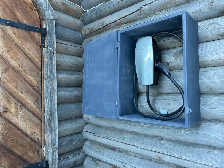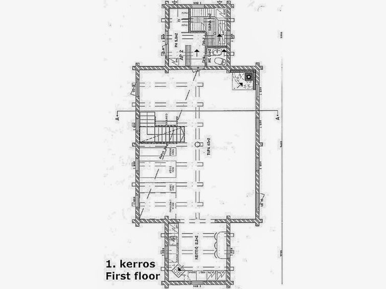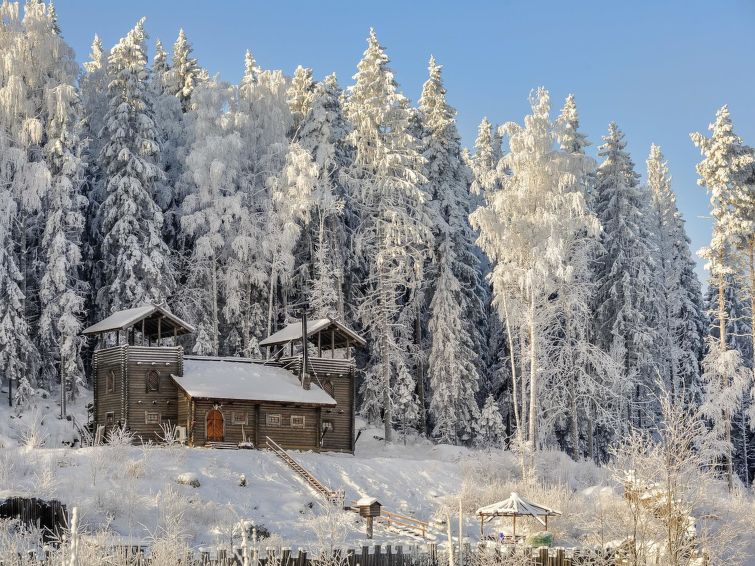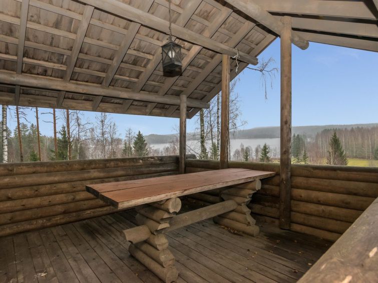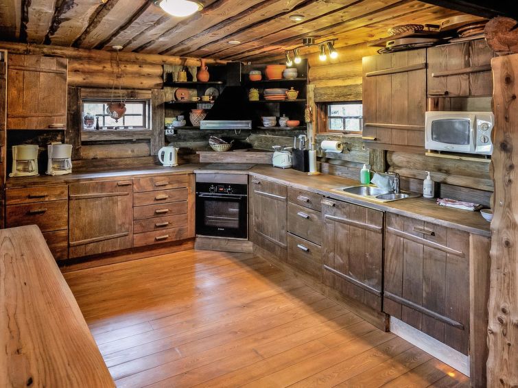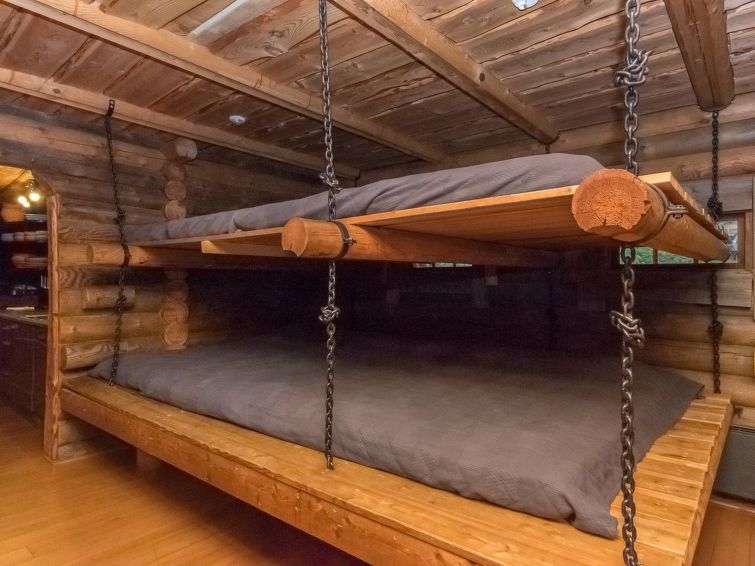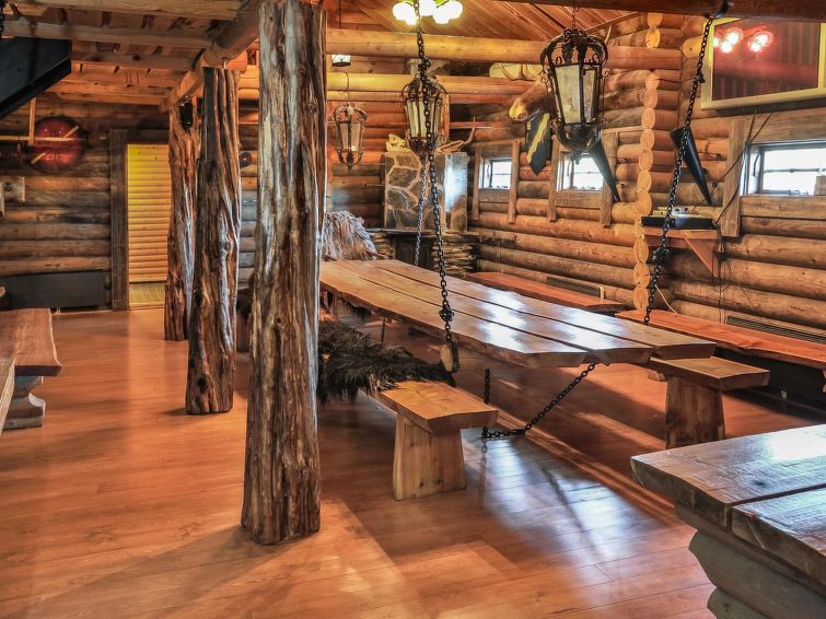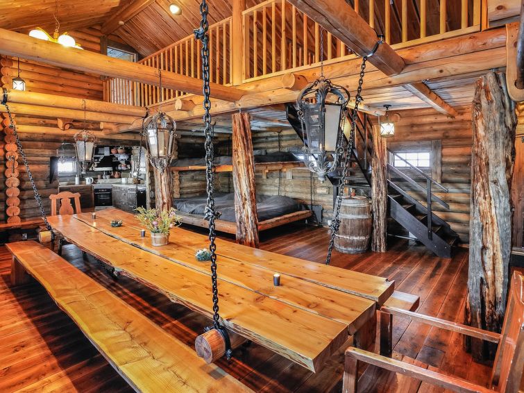 Log cabin 2006, living room/kitchen 8 extra beds (bunk for 8 persons), bedroom 2 beds, second bedroom 2 beds, sleeping loft 5 extra beds, sauna (electric sauna stove), washroom (2 x shower), open porch, 2 towers. Toilet on the upper floor and ground floor. A separate underground smoke sauna on the hill and hot tub can be rented separately.